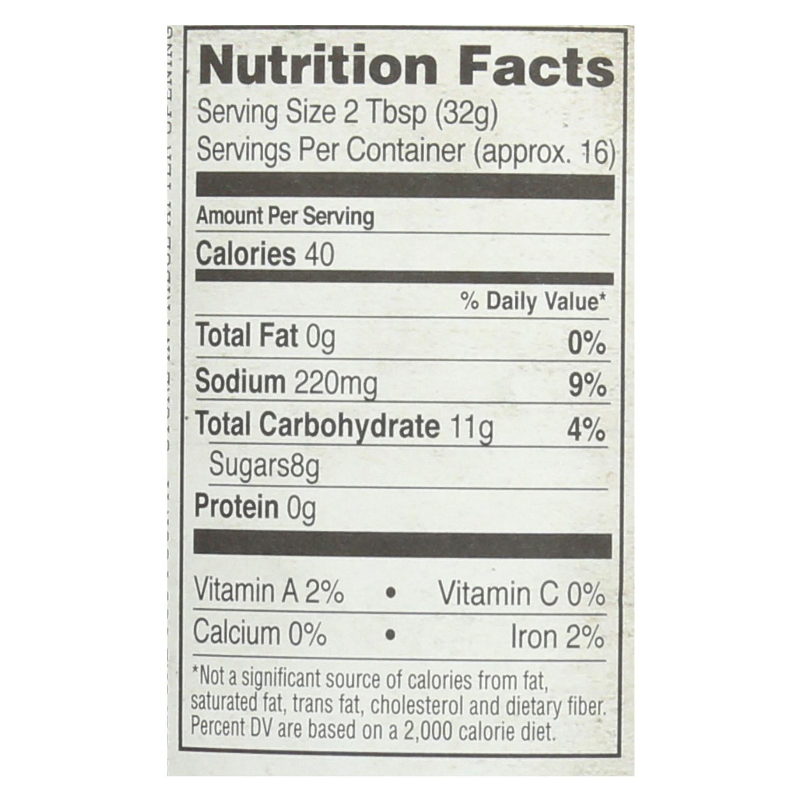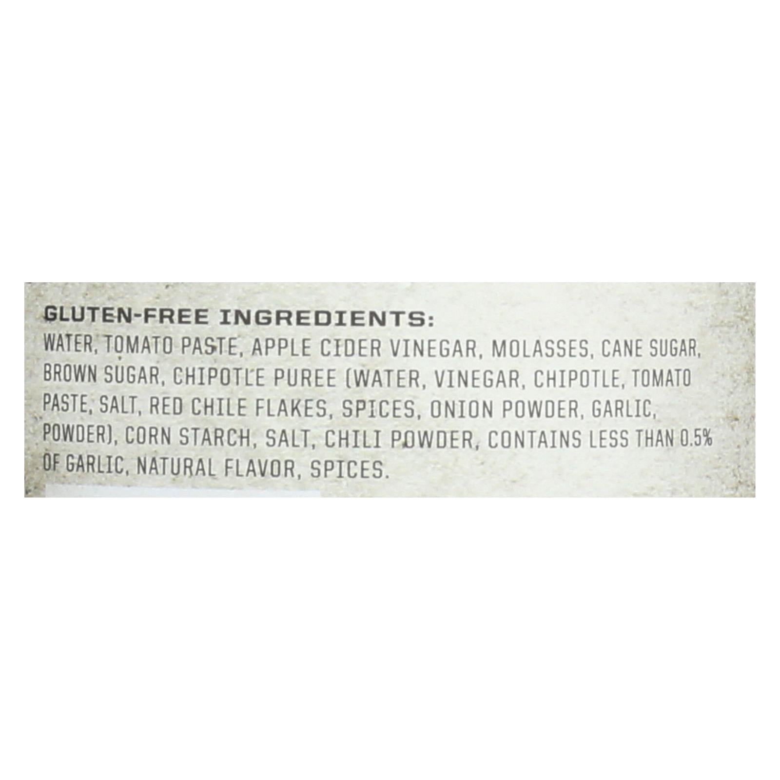 ingredients : water;tomato paste;apple cider vinegar;molasses;cane sugar;brown sugar;chipotle puree;vinegar;chipotle;salt;red chile flakes;spices;onion powder;garlic;powder;corn starch;chili powder;contains less than 0.5% of garlic;natural flavor