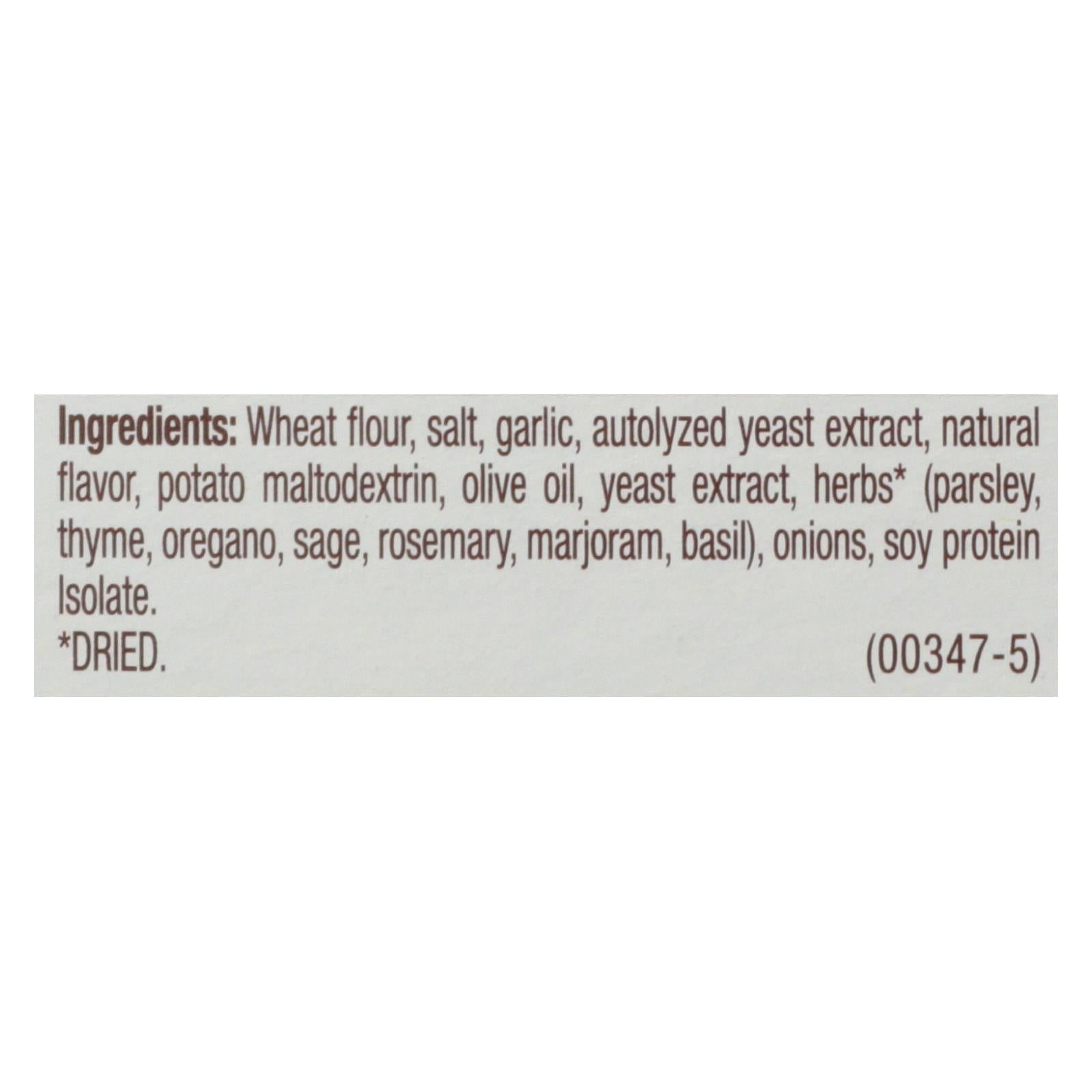 ingredients : wheat flour;salt;garlic;autolyzed yeast extract;natural flavor;potato maltodextrin;olive oil;yeast extract;herbs;parsley;thyme;oregano;sage;rosemary;marjoram;basil;onions;soy protein isolate