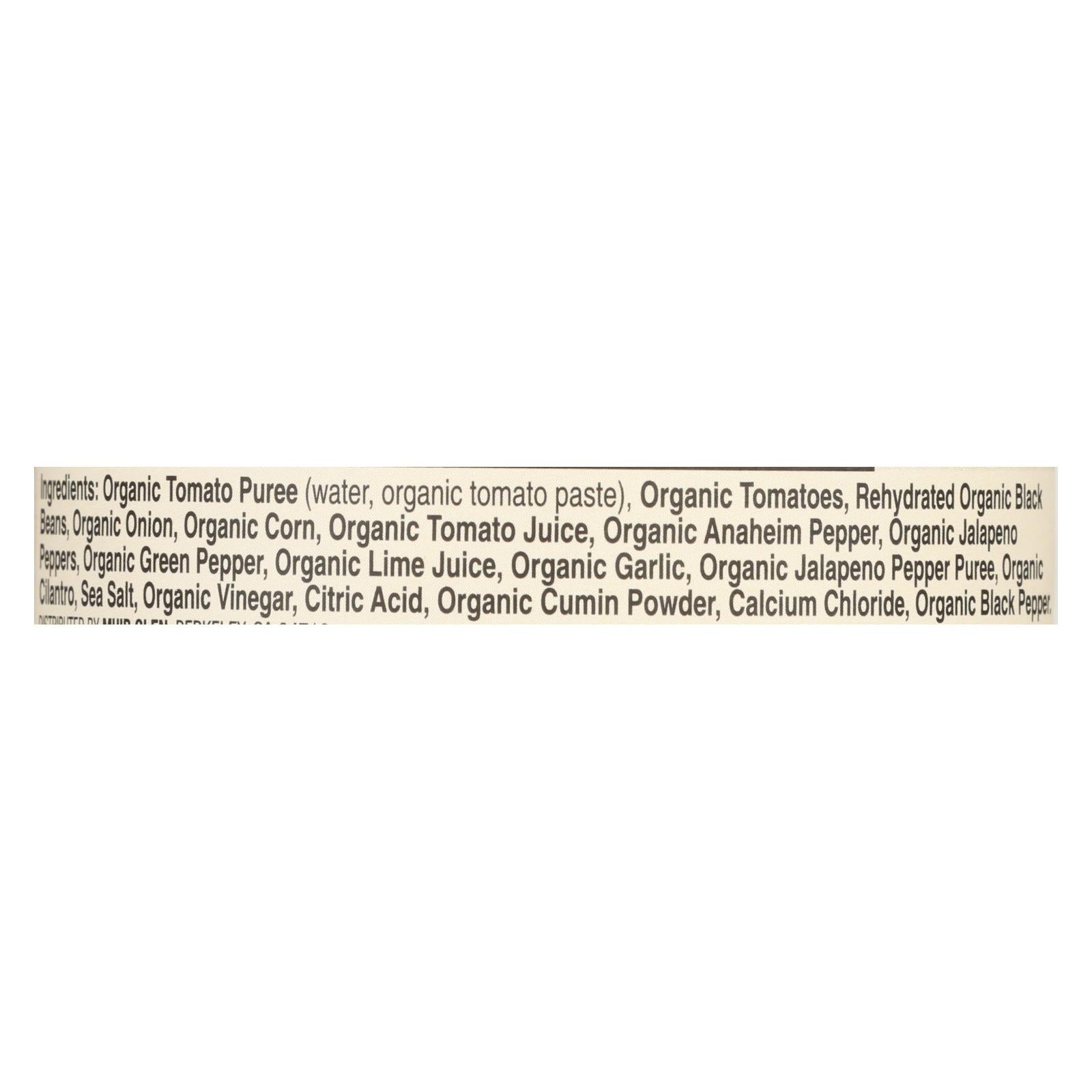 ingredients : organic tomato puree;water;organic tomato paste;organic tomatoes;rehydrated organic black beans;organic onion;organic corn;organic tomato juice;organic anaheim pepper;organic jalapeno peppers;organic green pepper;organic lime juice;organic garlic;organic jalapeno pepper pure;organic cilantro;sea salt;organic vinegar;citric vinegar;citric acid;organic cumin powder;calcium chloride;organic black pepper