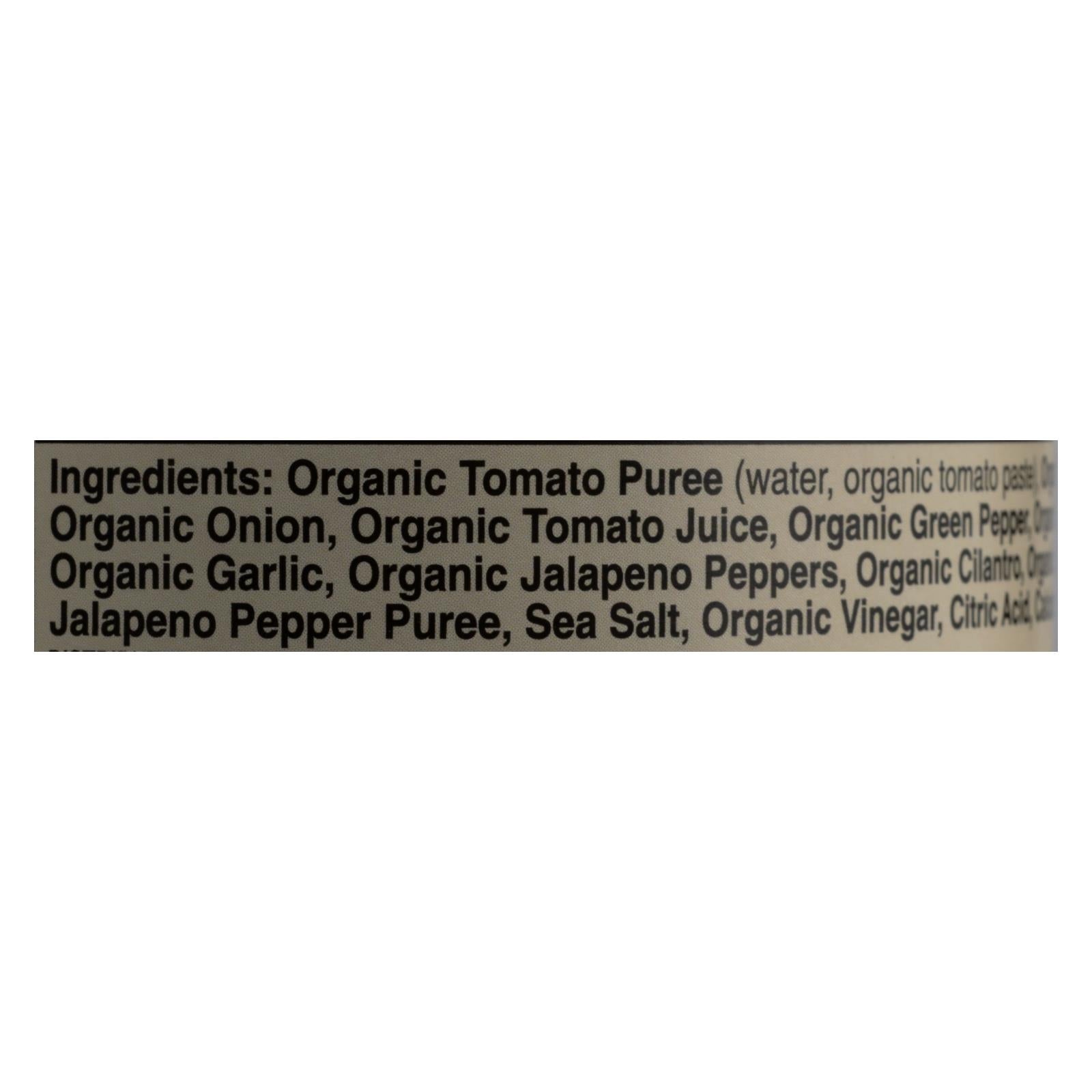 ingredients : organic tomato puree;water;organic tomato paste;organic tomatoes;organic onion;organic tomato juice;organic green pepper;organic anaheim pepper;organic garlic;organic jalapeno peppers;organic cilantro;organic lime juice;organic jalapeno pepper puree;sea salt;organic vinegar;citric acid;calcium chloride