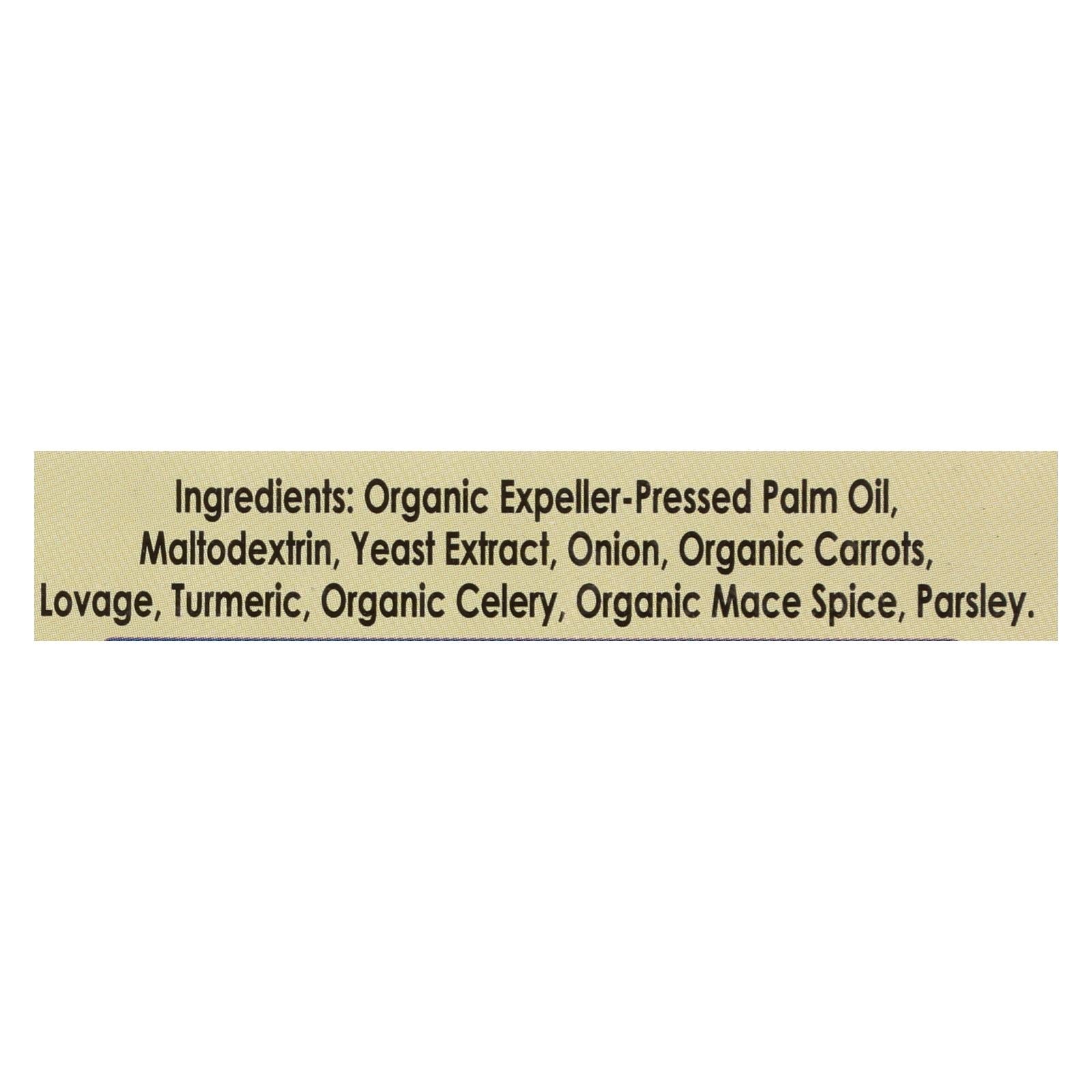 ingredients : organic expeller-pressed palm oil;maltodextrin;yeast extract;onion;organic carrots;lovage;turmeric;organic celery;organic mace spice;parsley