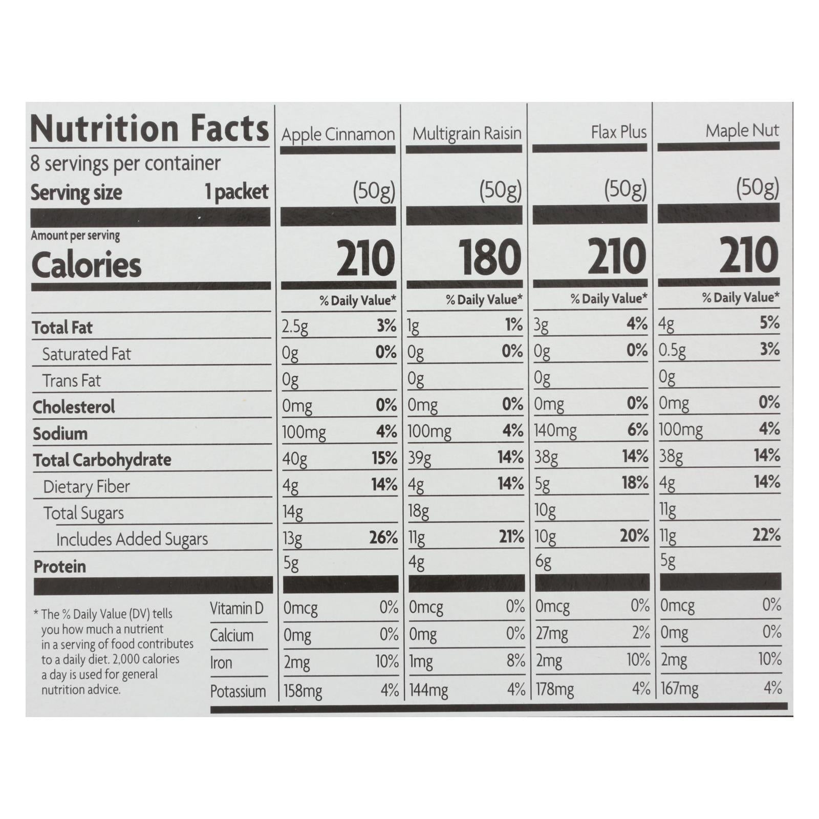 Nature's path hot oatmeal variety pack of 8 is made with organic ingredients and is high in fiber. This variety pack provides a box of 2 packets each of apple cinnamon, multigrain raisin, flax plus and maple nut, containing whole grains, protein and fiber. Our hot oatmeal is made with kosher ingredients that are gmo-free and vegan. We use usda organic certified grains. See nutrition facts panel for allergens.