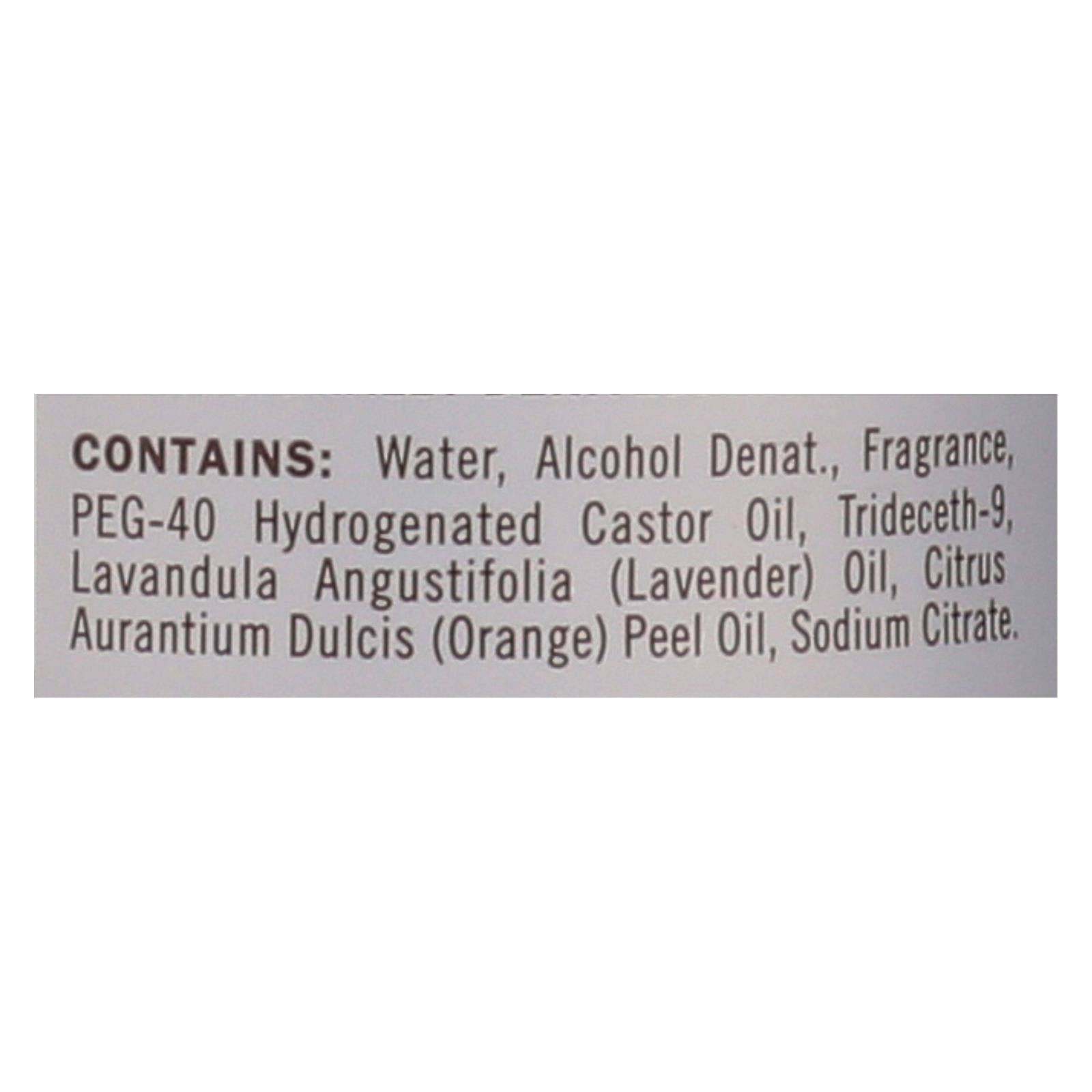 ingredients : contains: water;alcohol denat;fragrance;peg-40 hydrogenated castor oil;trideceth-9;lavandula angustifolia;lavender;oil;citrus aurantium dulcis;orange;peel oil;sodium citrate
