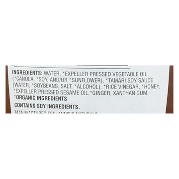 ingredients : water;expeller-pressed soybean oil;tamari soy sauce* (water, soybeans*, salt, alcohol*);honey;rice vinegar;expeller-pressed toasted sesame seed oil;ginger;xanthan gum