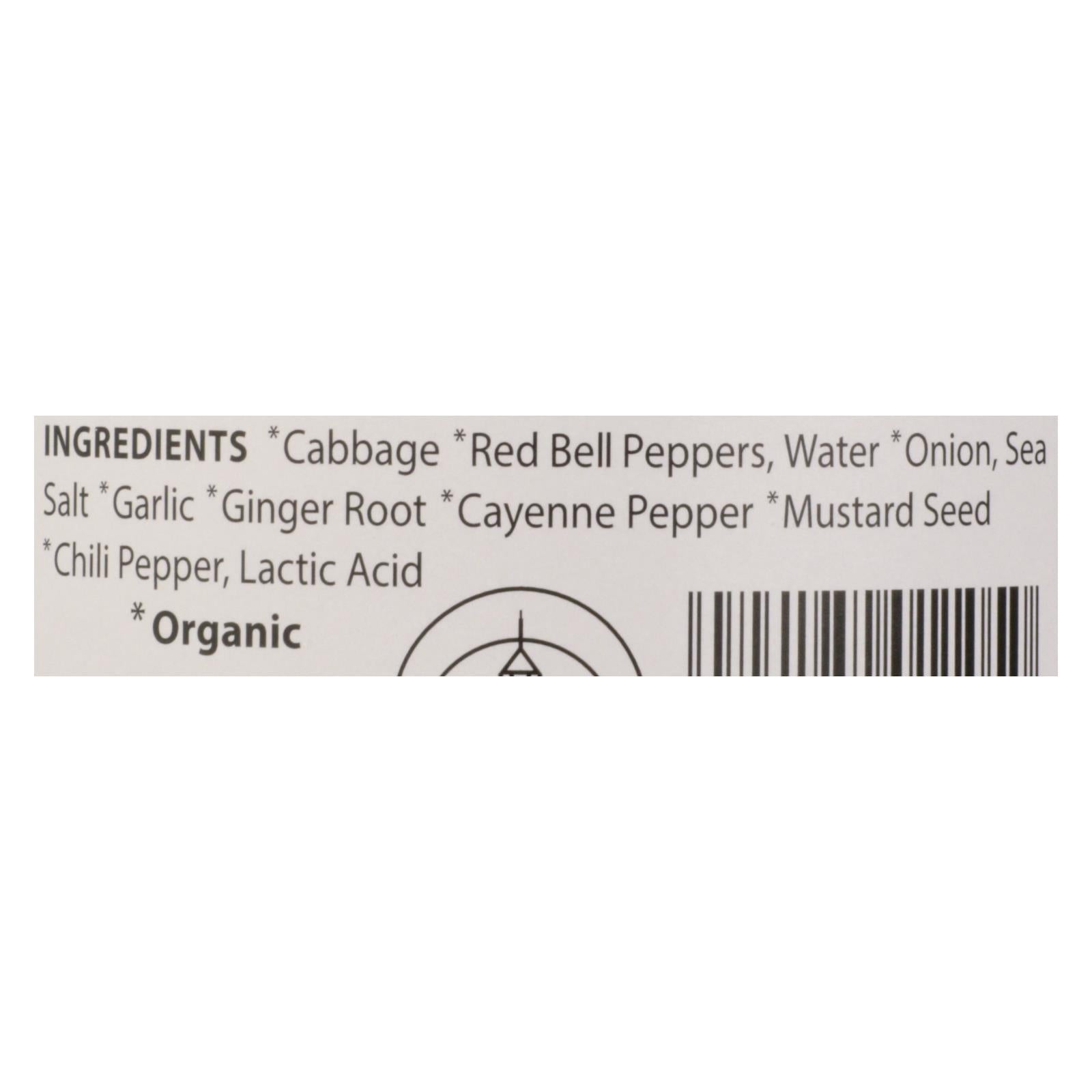 ingredients : cabbage *red bell peppers;water *onion;sea salt *garlic *ginger root *cayenne pepper *mustard seed *chili pepper;lactic acid