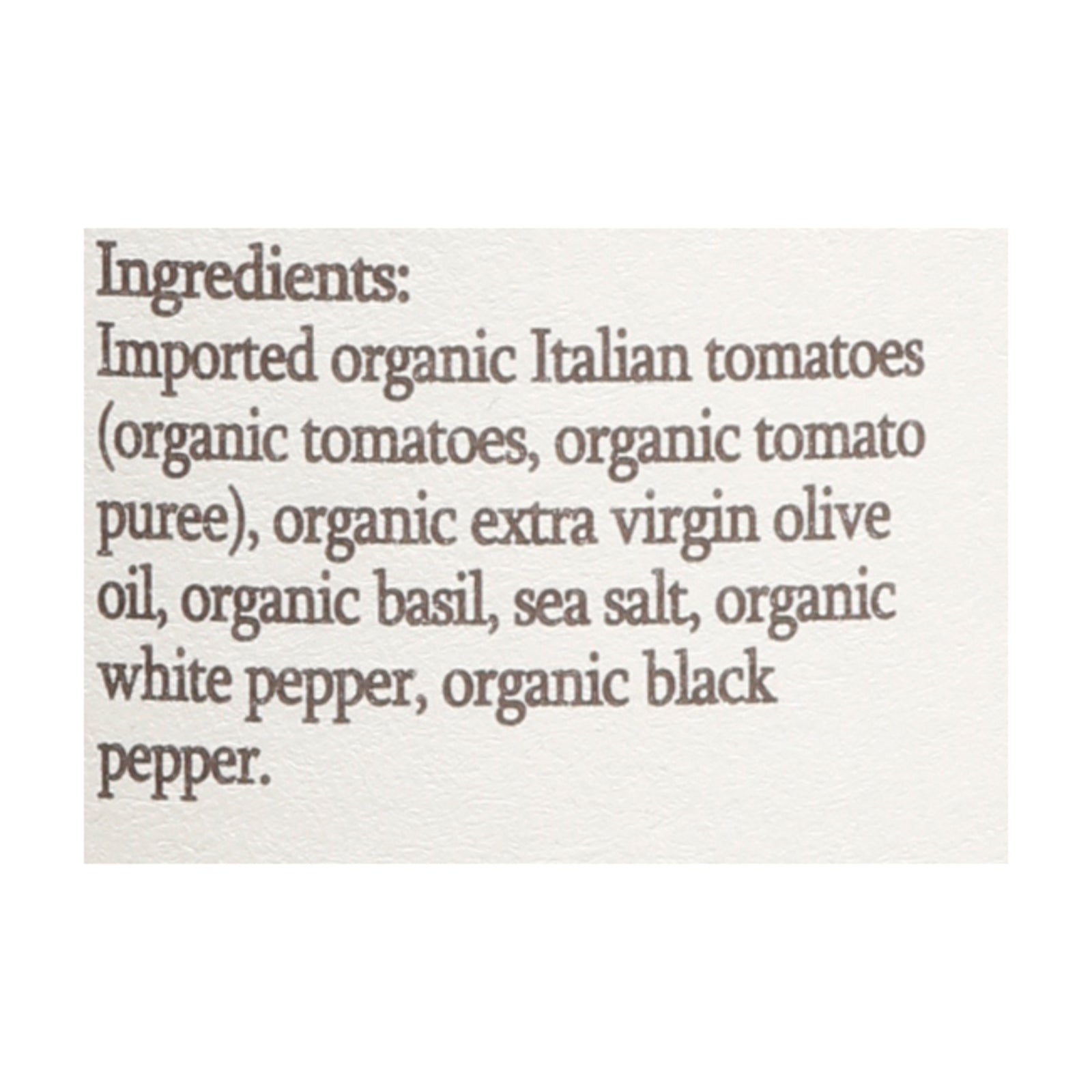ingredients : imported organic italian tomatoes;organic tomatoes;organic tomato puree;organic extra virgin olive oil;organic basil;sea salt;organic white pepper;organic black pepper