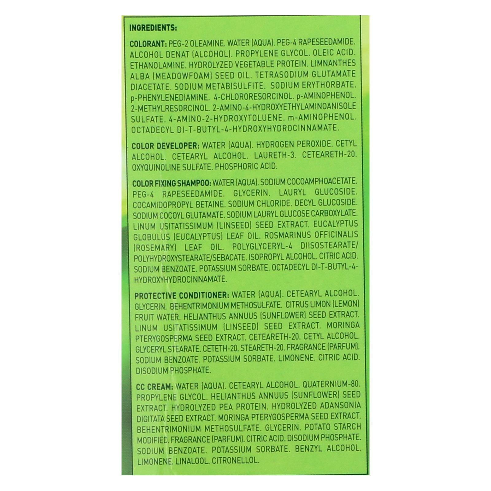 ingredients : cc cream: water;aqua;cetearyl alcohol;quaternium-80;propylene glycol. Helianthus annuus;sunflower;seed extract. Hydrolyzed pea protein. Hydrolyzed adansonia digitata seed extract. Moringa pterygosperma seed extract. Behentrimonium methosulfate. Glycerin. Potato starch modified. Fragrance;parfum;citric acid. Disodium phosphate. Sodium benzoate. Potassium sorbate. Benzyl alcohol. Limonene. Linalool. Citronellol;color developer: water;hydrogen peroxide. Cetyl alcohol. Cetearyl alcohol. Laureth-3. C