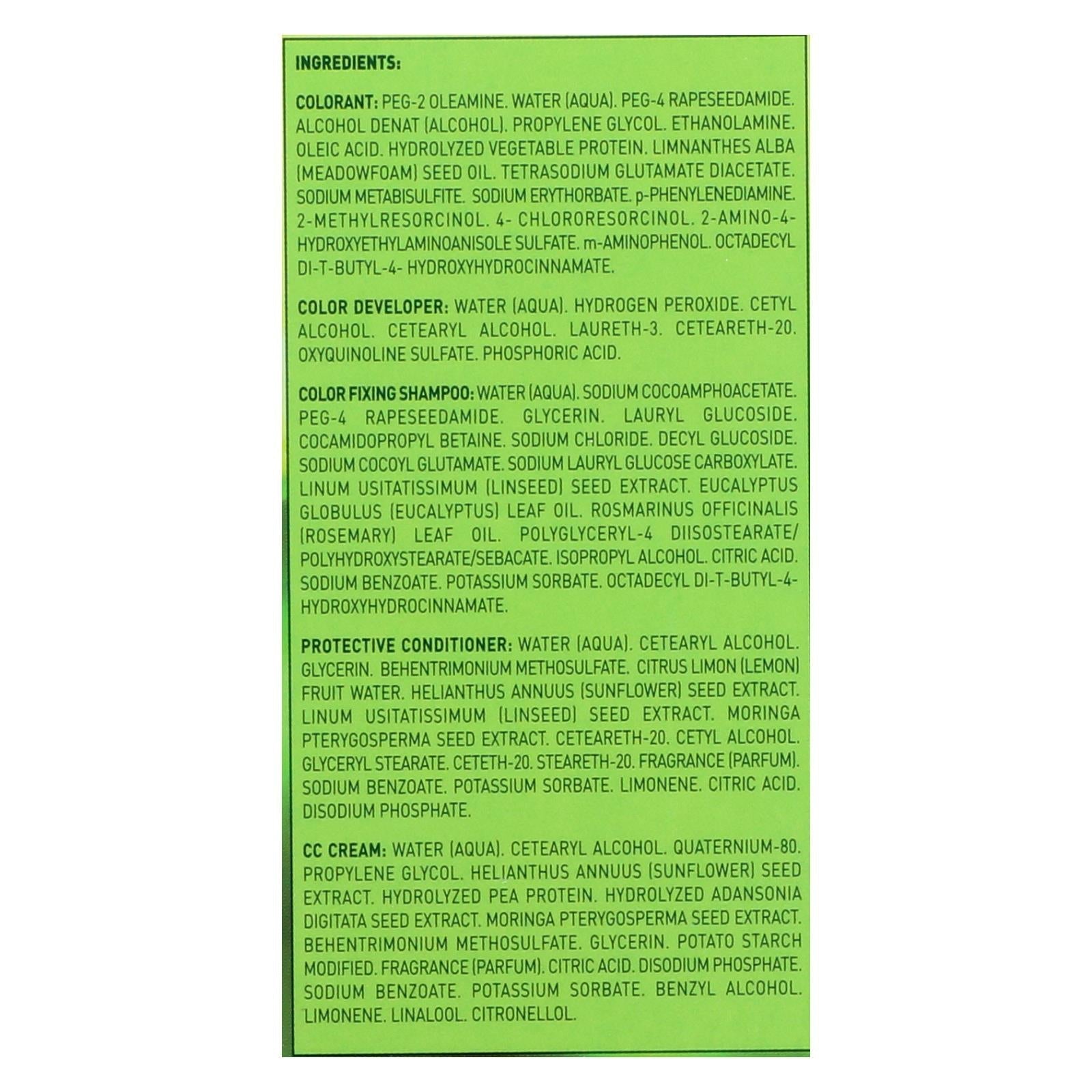 ingredients : cc cream: water;aqua;cetearyl alcohol;quaternium-80;propylene glycol. Helianthus annuus;sunflower;seed extract. Hydrolyzed pea protein. Hydrolyzed adansonia digitata seed extract. Moringa pterygosperma seed extract. Behentrimonium methosulfate. Glycerin. Potato starch modified. Fragrance;parfum;citric acid. Disodium phosphate. Sodium benzoate. Potassium sorbate. Benzyl alcohol. Limonene. Linalool. Citronellol;color developer: water;hydrogen peroxide. Cetyl alcohol. Cetearyl alcohol. Laureth-3. C