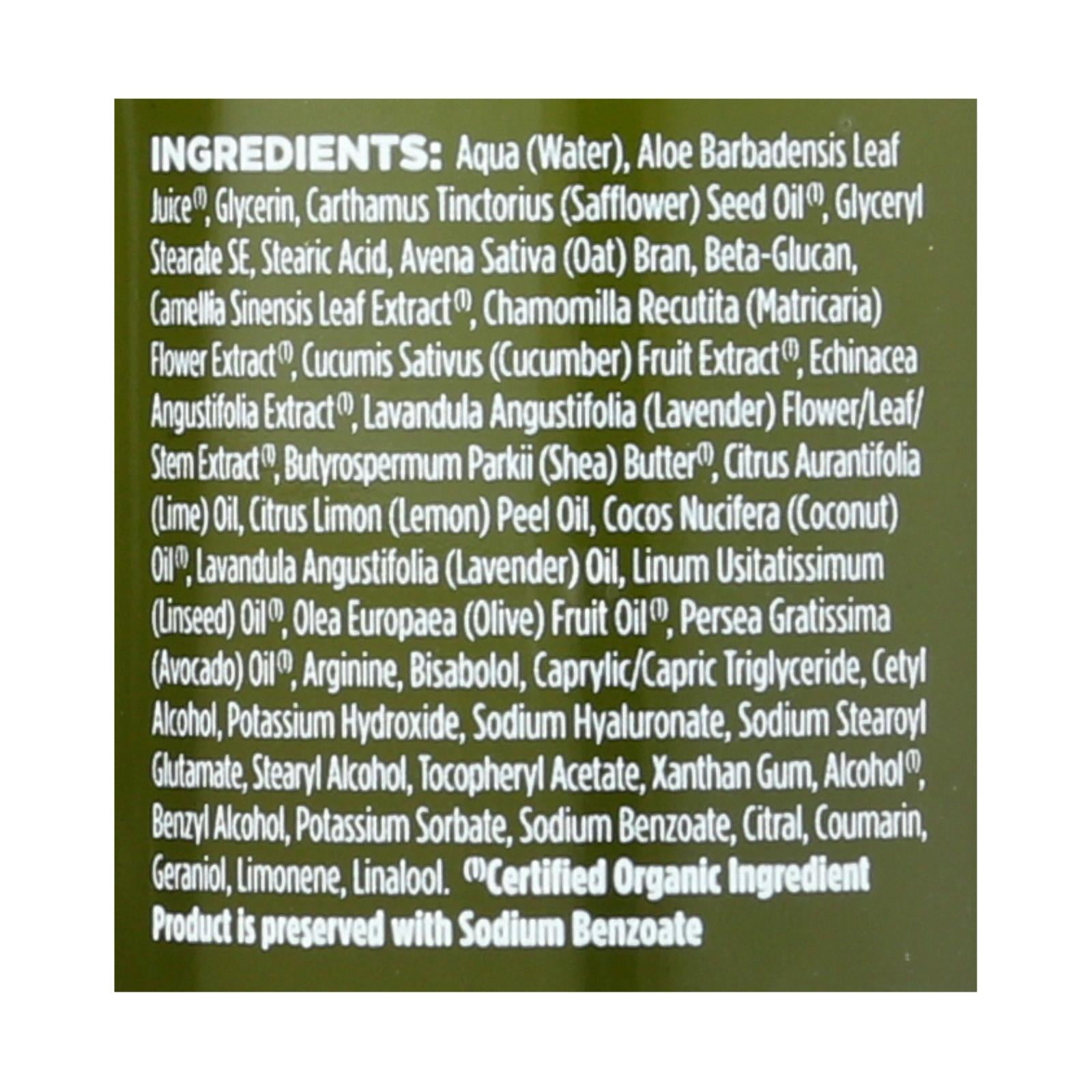 ingredients : aqua;water;aloe barbadensis leaf juice;¹;glycerin;carthamus tinctorius;safflower;seed oil;glyceryl stearate se;stearic acid;avena sativa;oat;bran;beta-glucan;camellia sinensis leaf extract;chamomilla recutita;matricaria;flower extract;cucmis sativus;cucumber;fruit extract;echinacea angustifolia extract;lavandula angustifolia;lavender;flower/leaf/stem extract;butyrospermum parkii;shea;butter;citrus aurantifolia;lime;oil;citrus limon;lemon;peel oil;cocos nucifera;coconut;linum usitatissimum;linsee
