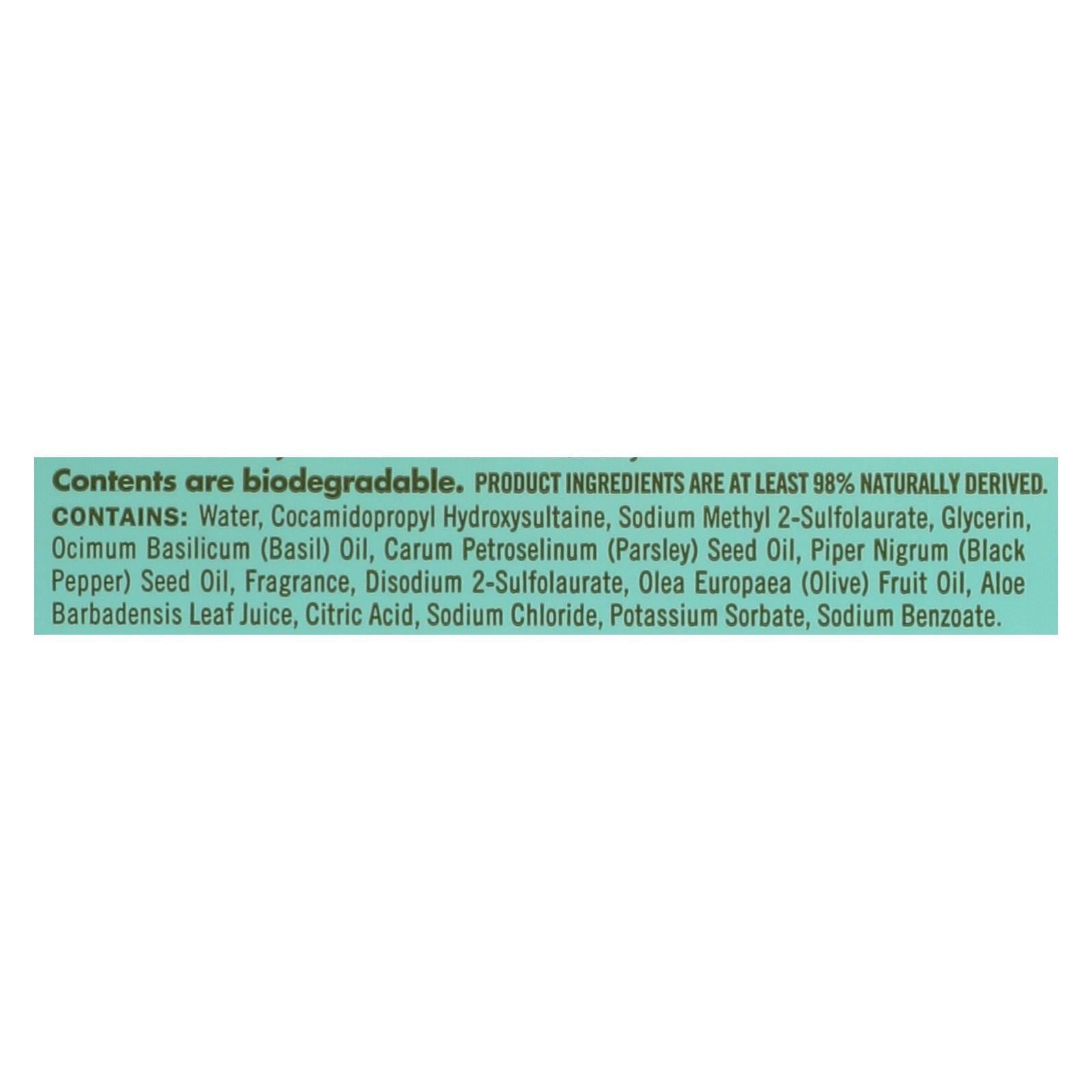 ingredients : water;cocamidopropyl hydroxysultaine;sodium methyl 2-sulfolaurate;glycerin;ocimum basilicum;basil;oil;carum petroselinum;parsley;seed oil;piper nigrum;black pepper;fragrance;disodium 2-sulfolaurate;olea europaea;olive;fruit oil;aloe barbadensis leaf juice;citric acid;sodium chloride;potassium sorbate;sodium benzoate