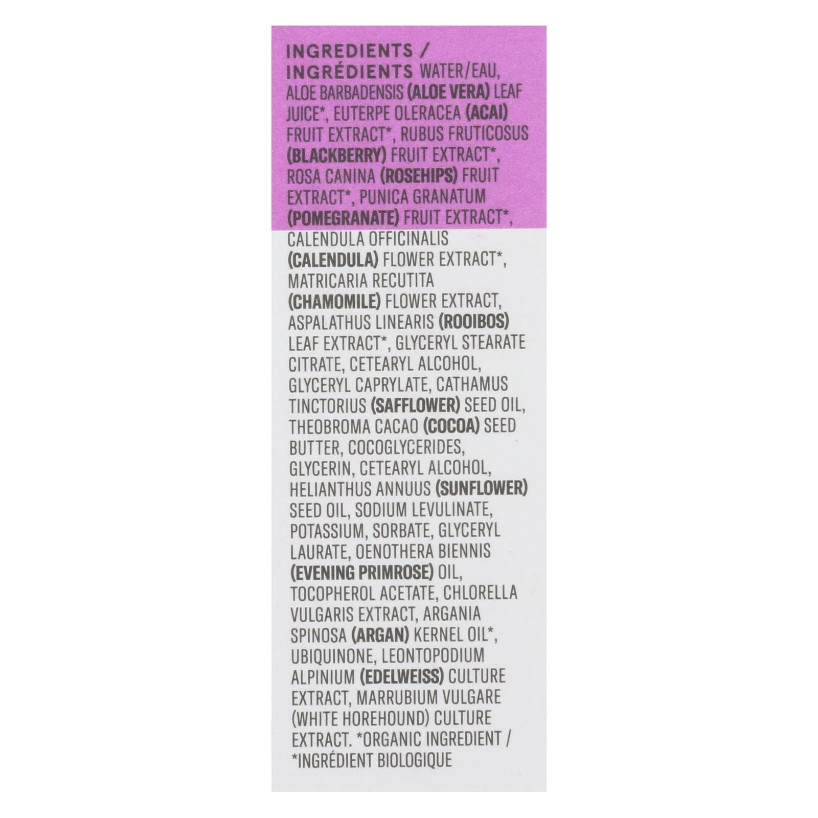 ingredients : argan;argania spinosa;carthamus tinctorius;chlorella vul garlic extract;chlorella vulgaris extract;chlorella vulgaris extract;cocoa;culture extract;fruit extract;glyceryl laurate;glyceryl stearate citrate;helianthus annuus;leaf juice;leontopodium alpinum;rooibos;seed butter;ubiquinone;water;aloe barbadensis;aloe vera;euterpe oleracea;acai;rubus fruiticosus;blackberry;rosa canina;rosehips;punica granatum;pomegranate;calendula officinalis;calendula;flower extract;matricaria recutita;chamomile;as