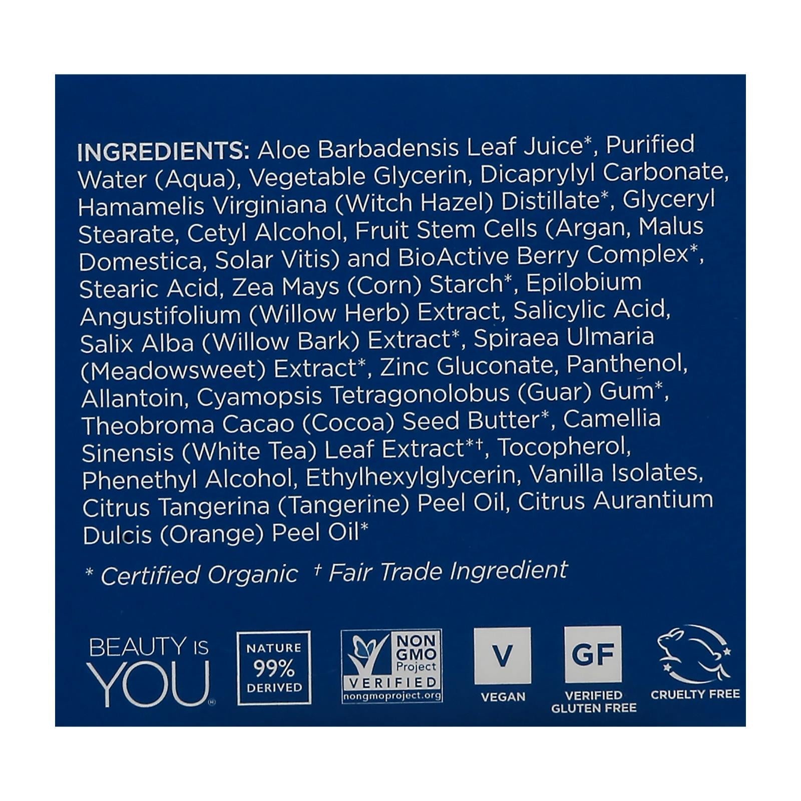 ingredients : aloe barbadensis leaf juice;purified water;aqua;vegetable glycerin;dicaprylyl carbonate;hamamelis virginiana;witch hazel;distillate;glyceryl stearate;cetyl alcohol;fruit stem cells;argan;malus domestica;solar vitis;and bioactive 8 berry complex;stearic acid;zea mays;corn;starch;epilobium angustifolium;willow herb;extract;salicylic acid;salix alba;willow bark;zinc gluconate;panthenol;allantoin;cyamopsis tetragonolobus;guar;gum;theobroma cacao;cocoa;seed butter;camellia sinensis;white tea;leaf ext