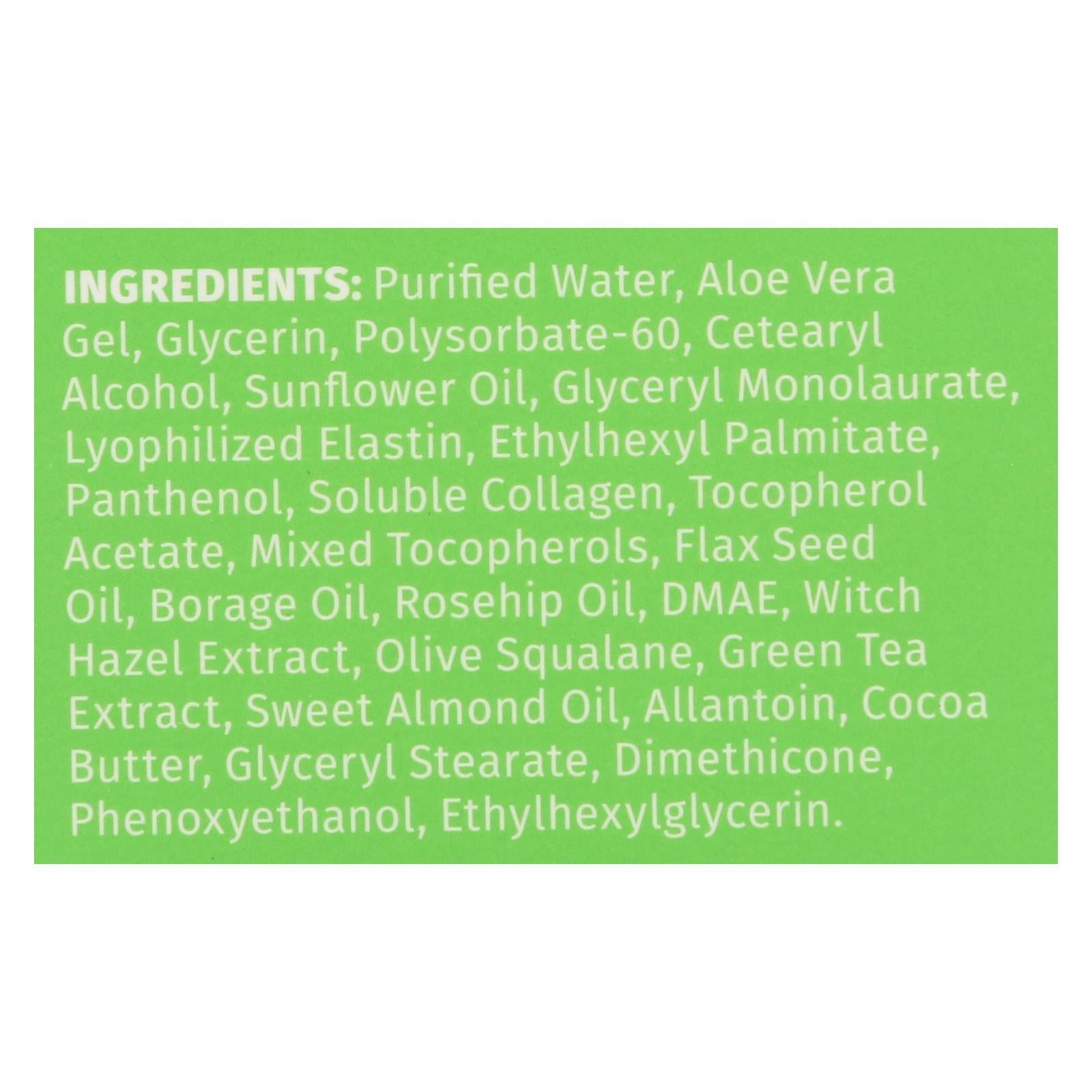 ingredients : purified water;aloe vera gel;glycerin;polysorbate-60;cetearyl alcohol;sunflower oil;glyceryl monolaurate;lyophilized elastin;ethylhexyl palmitate;panthenol;soluble collagen;tocopherols;acetate;mixed tocopherols;flax seed oil;borage oil;rosehip oil;dmae;witch hazel extract;olive squalane;green tea extract;sweet almond oil;allantoin;cocoa butter;glyceryl stearate;dimethicone;phenoxyethanol;ethylhexylglycerin