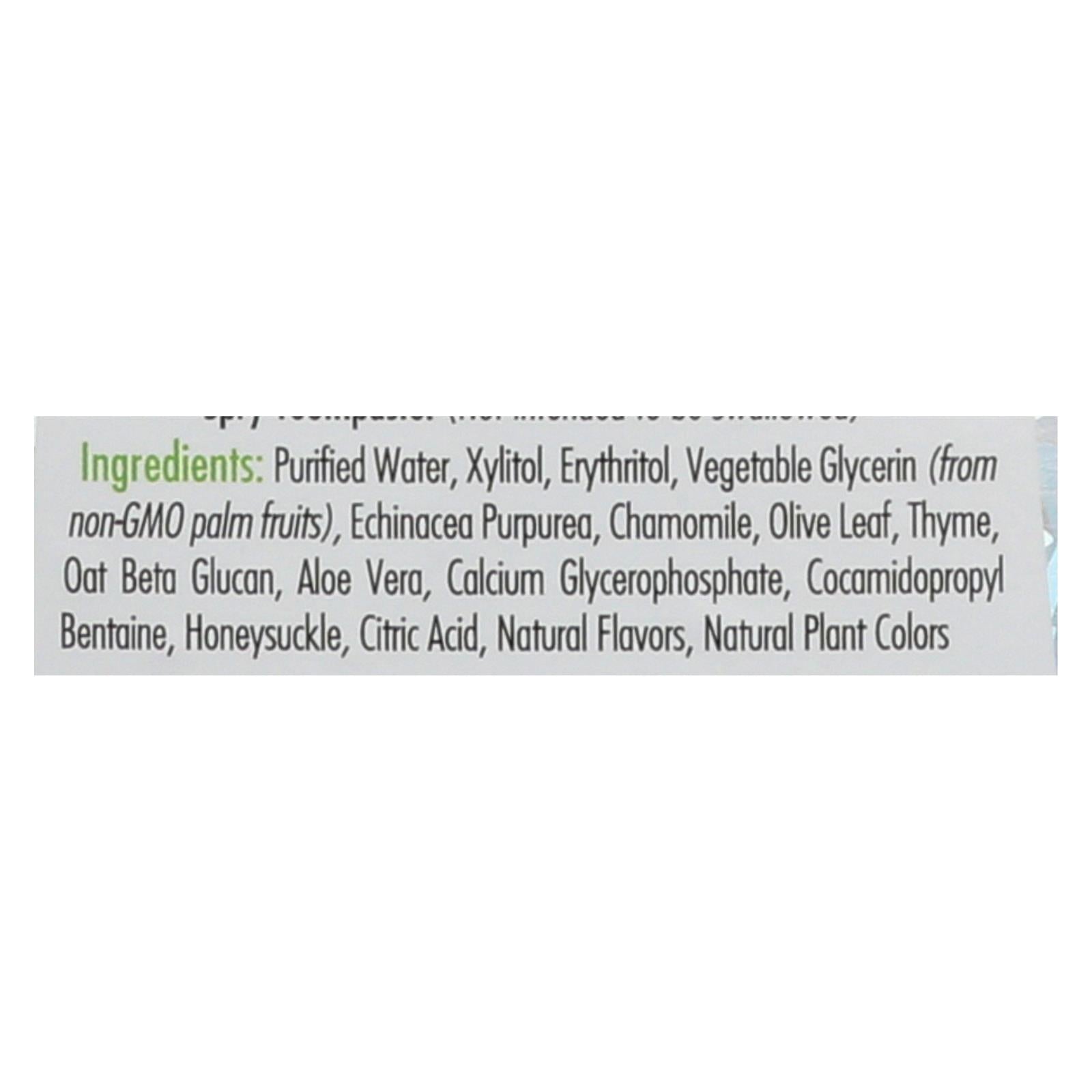 ingredients : purified water;xylitol;erythritol;vegetable glycerin;from non-gmo palm fruits;echinacea purpurea;chamomile;olive leaf;thyme;oat beta glucan;aloe vera;calcium glycerophosphate;cocamidopropyl bentaine;honeysuckle;citric acid;natural flavors;natural plant colors