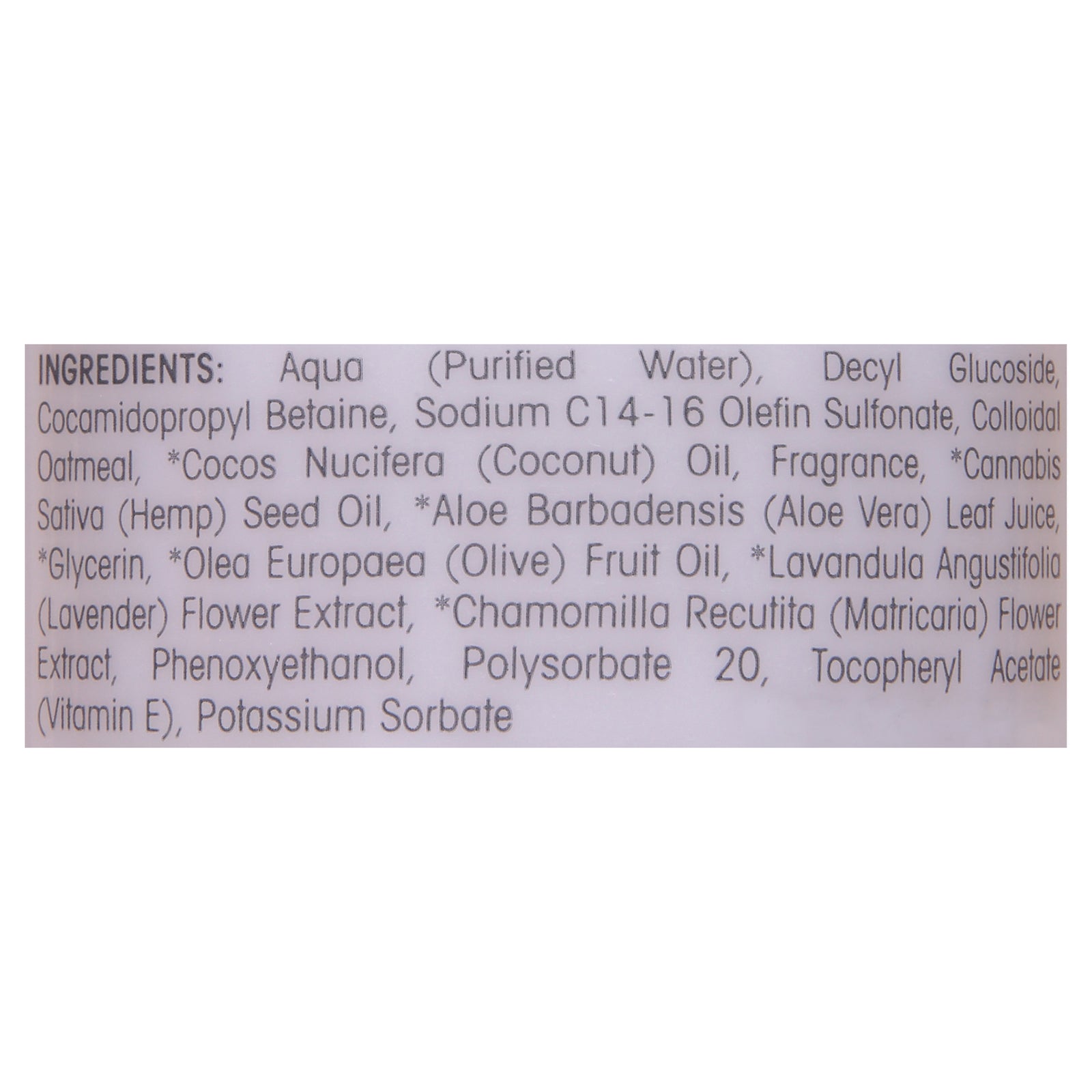 ingredients : aqua (purified water);decyl glucoside;cocamidopropyl betaine;sodium c14-16 olefin sulfonate;colloidal oatmeal;cocos nucifera (coconut) oil;fragrance;cannabis sativa (hemp) seed oil;aloe barbadensis (aloe vera) leaf juice;glycerin;olea europaea (olive) fruit oil;lavandula angustifolia (lavender) flower extract;chamomilla recutita (matricaria) flower extract;phenoxyethanol;polysorbate 20;tocopheryl acetate (vitamin e);potassium sorbate