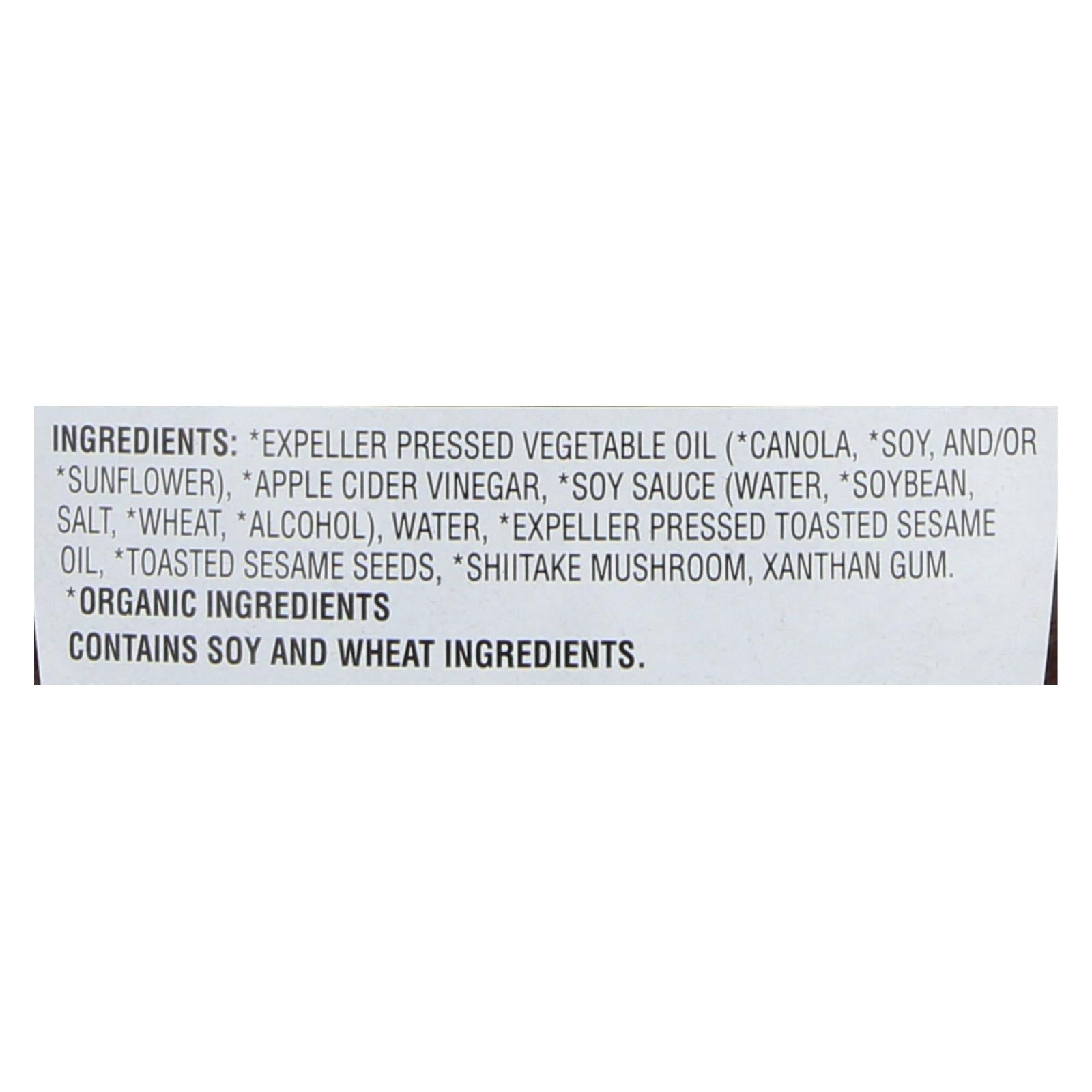 ingredients : expeller-pressed canola oil;apple cider vinegar;soy sauce* (water, soybeans*, wheat*, salt, alcohol*);water;expeller-pressed toasted sesame seed oil;toasted sesame seeds;dried shiitake mushrooms;xanthan gum