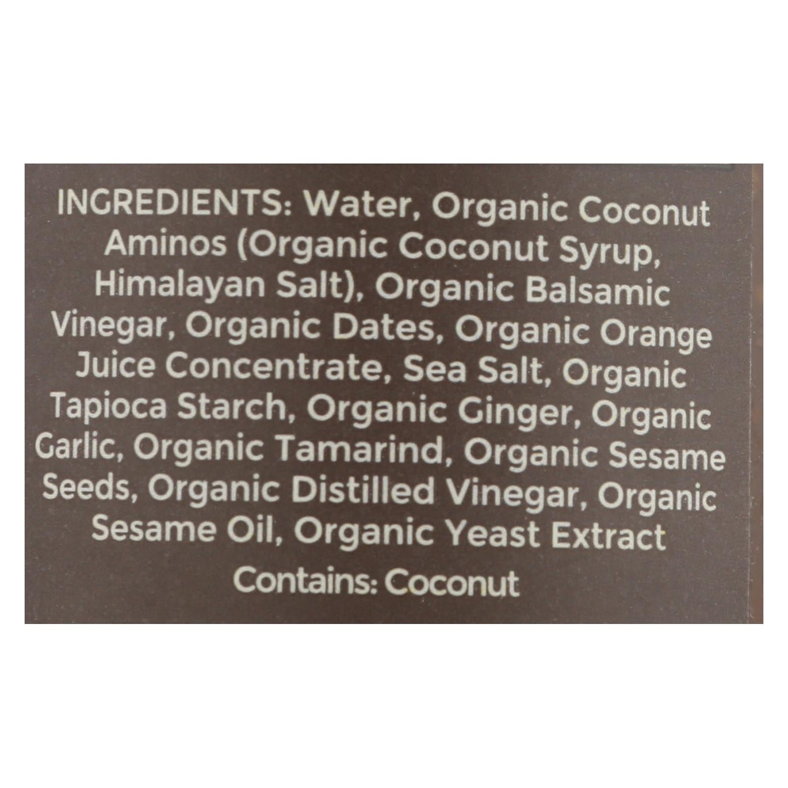 ingredients : water;organic coconut aminos;organic coconut syrup;himalayan salt;organic balsamic vinegar;organic wine vinegar;organic concentrated grape must;organic dates;organic orange juice concentrate;sea salt;organic tapioca starch;organic ginger;organic garlic;organic tamarind;organic sesame seeds;organic distilled vinegar;organic sesame oil;organic yeast extract
