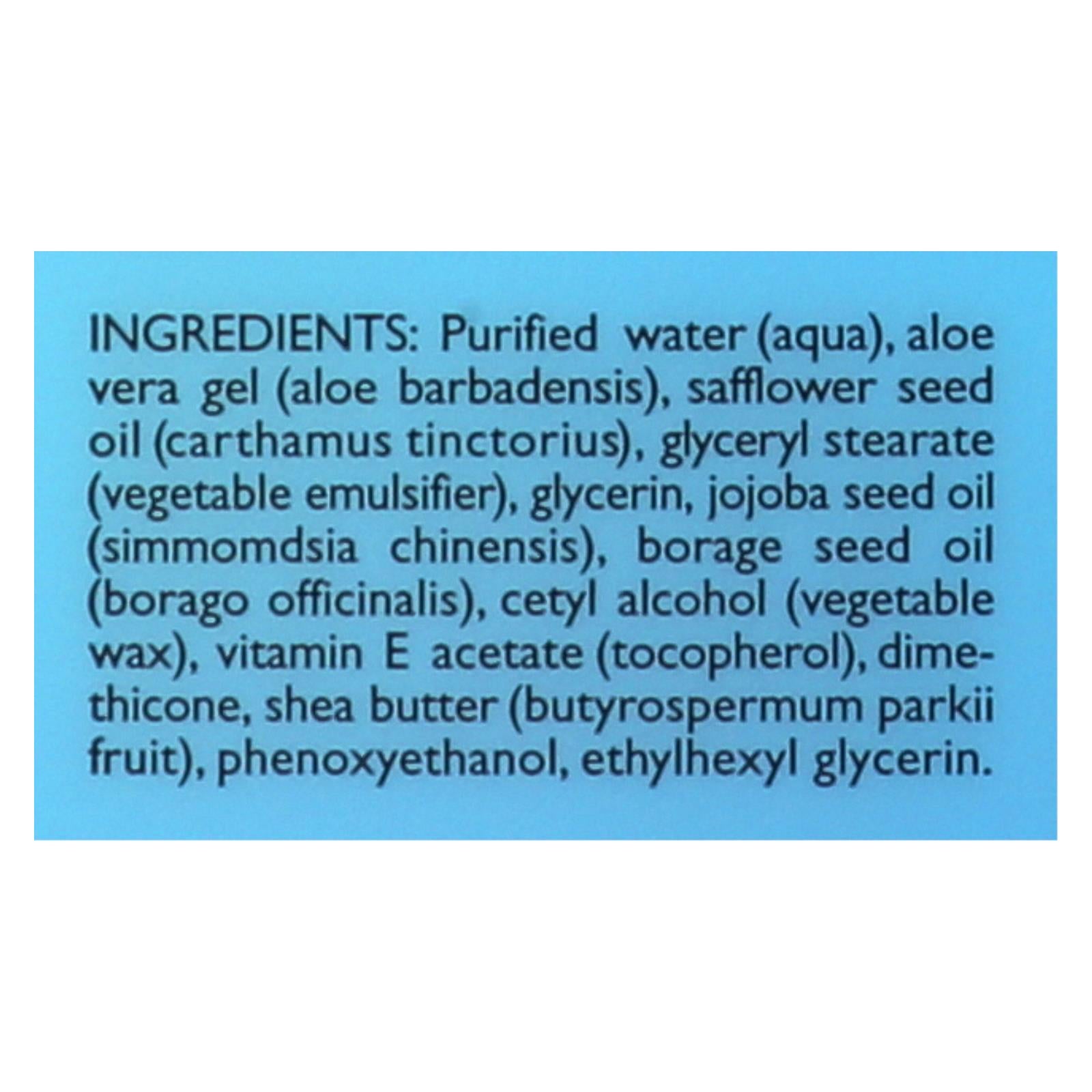 ingredients : purified water;aqua;aloe vera gel;aloe barbadensis;safflower seed oil;carthamus tinctorius;glyceryl stearate;vegetable emulsifier;glycerin;jojoba seed oil;simmomdsia chinensis;borage seed oil;borago officinalis;cetyl alcohol;vegetable wax;vitamin e acetate;tocopherol;dimethicone;shea butter;butyrospermum parkii fruit;phenoxyethanol;ethylhexyl glycerin