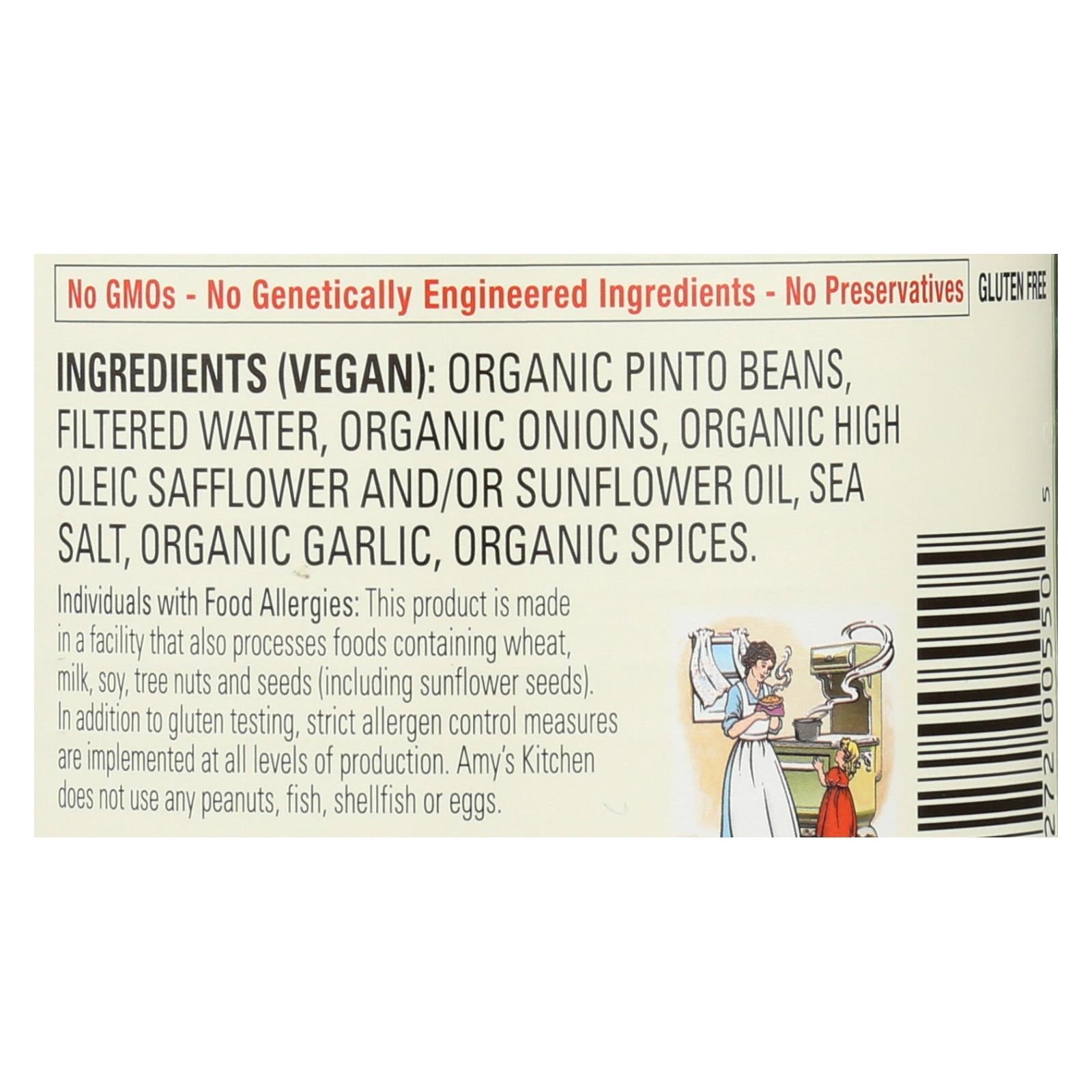 ingredients : organic pinto beans;filtered water;organic onions;organic high oleic safflower and/or sunflower oil;sea salt;organic garlic;organic spices