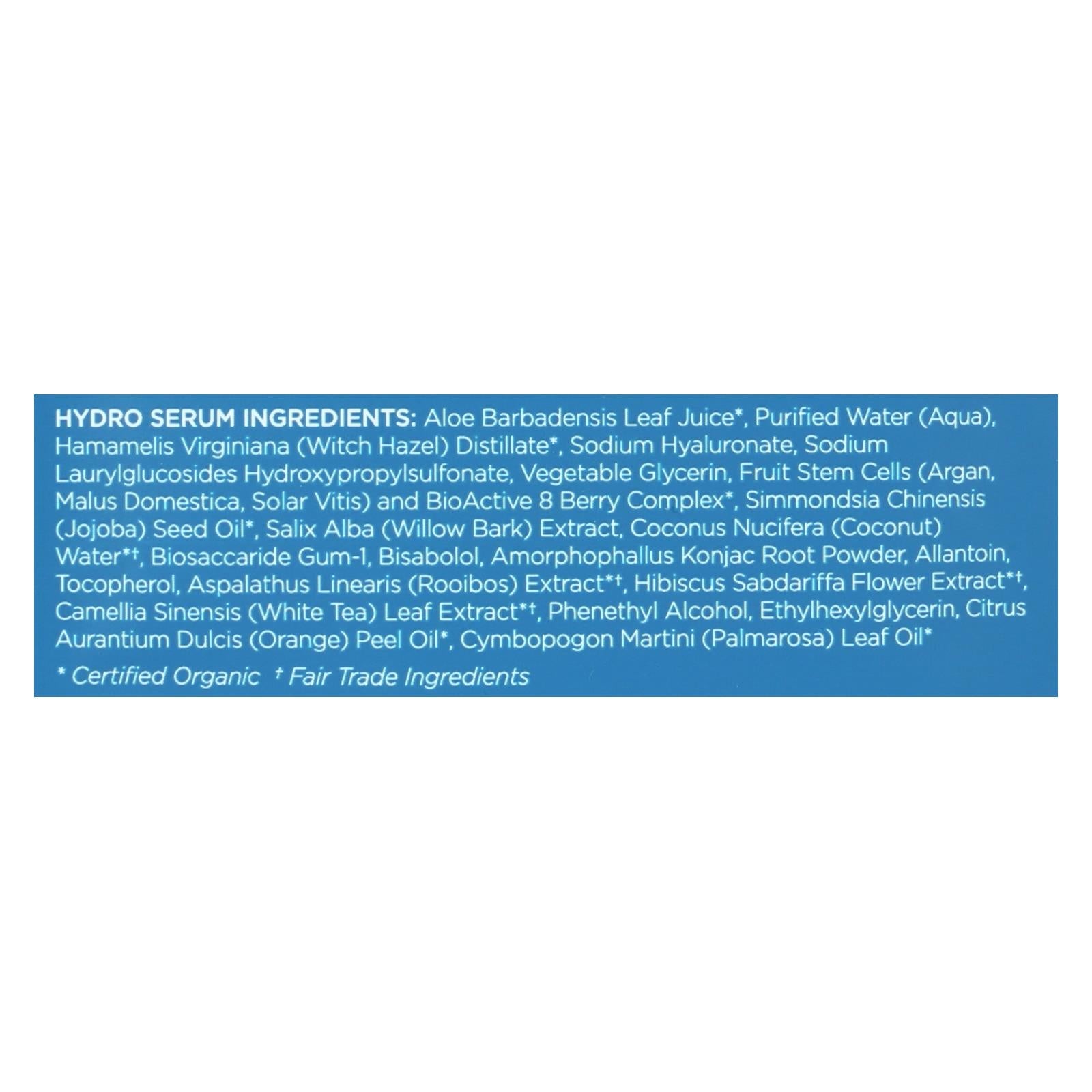 ingredients : hydro serum aloe barbadensis leaf juice;purified water;aqua;hamamelis virginiana;witch hazel;distillate;sodium hyaluronate;sodium laurylglucosides hydroxypropylsulfonate;vegetable glycerin;fruit stem cells;argan;malus domestica;solar vitis;and bioactive 8 berry complex;simmondsia chinensis;jojoba;seed oil;salix alba;willow bark;extract;coconus nucifera;coconut;water*†;biosaccaride gum-1;bisabolol;amorphophallus konjac root powder;allantoin;tocopherol;aspalathus linearis;rooibos;extract*†;hibiscu
