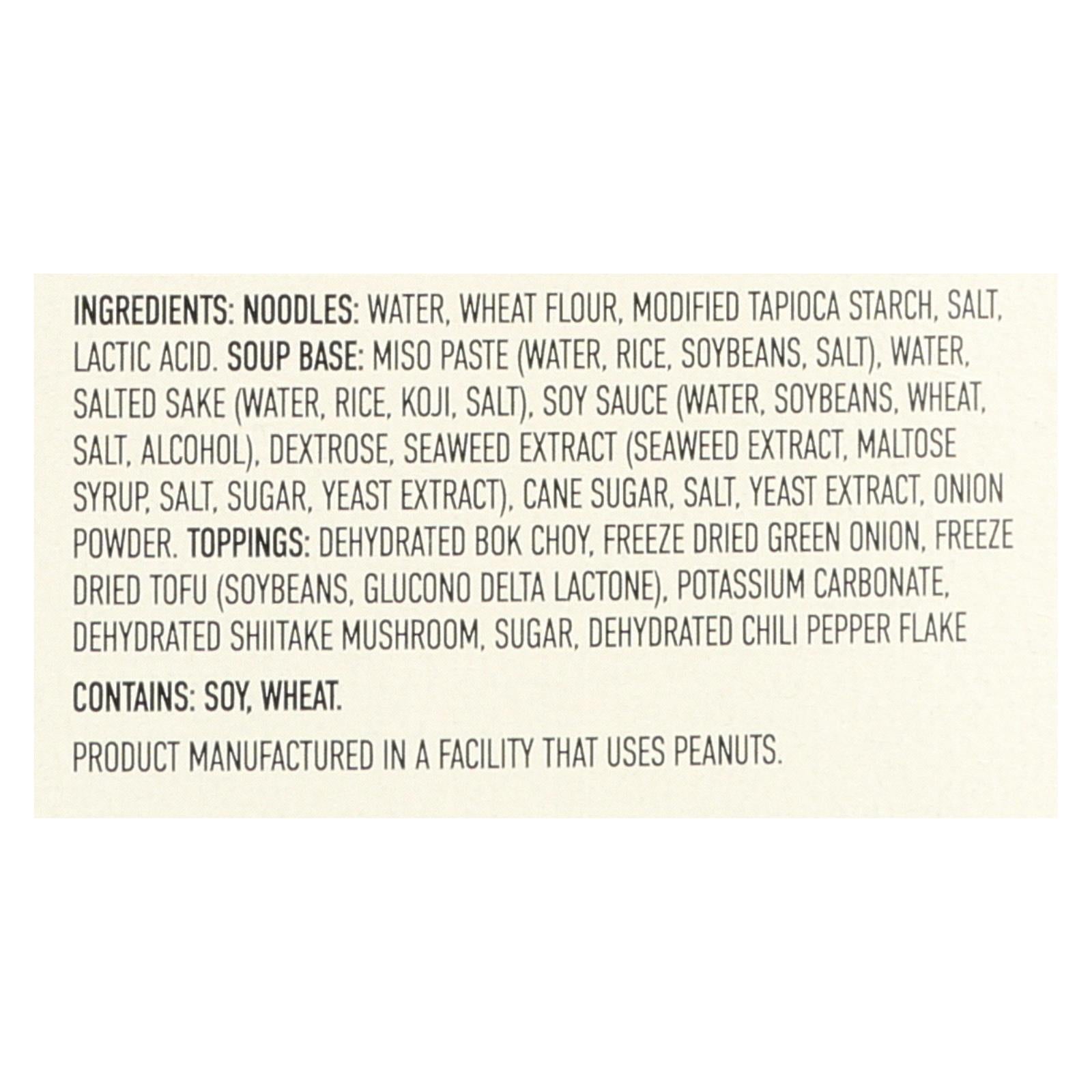 ingredients : noodles: water;wheat flour;modified tapioca starch;salt;lactic acid. Soup base: miso paste;water;rice;soybeans;salted sake;koji;soy sauce;wheat salt;alcohol;dextrose;seaweed extract;maltose syrup;sugar;yeast extract;cane sugar;onion powder. Toppings: dehydrated bok choy;freeze dried green onion;freeze dried tofu;glucono delta lactone;potassium carbonate;dehydrated shiitake mushroom;dehydrated chili pepper flake