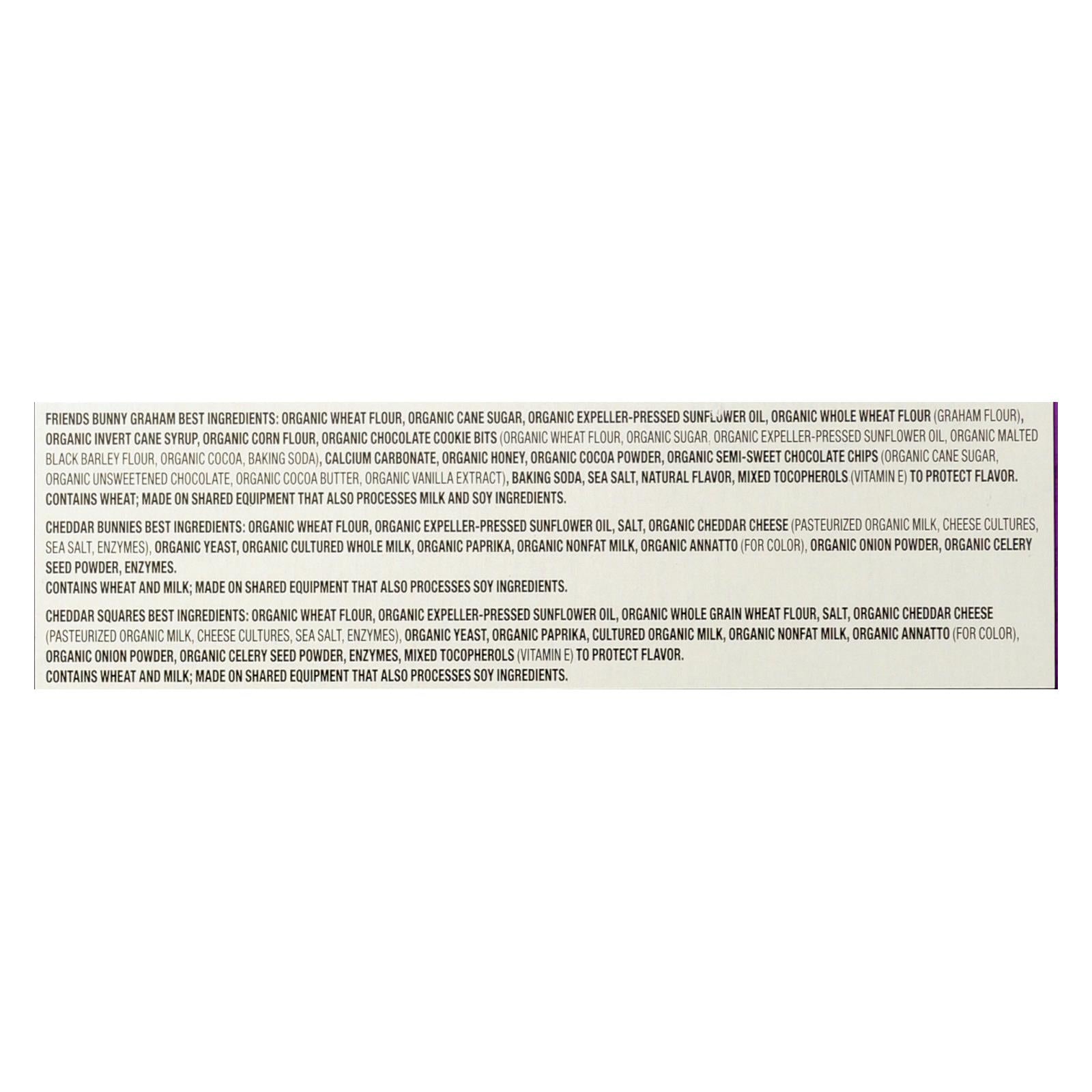 ingredients : cheddar bunnies best : organic wheat flour;organic expeller-pressed sunflower oil;salt;organic cheddar cheese;pasteurized organic milk;cheese cultures;sea salt;enzymes;organic yeast;organic cultured whole milk;organic paprika;organic nonfat milk;organic annatto;for color;organic onion powder;organic celery seed powder;cheddar squares best : organic wheat flour;organic whole grain wheat flour;cultured organic milk;mixed tocopherols;vitamin e;to protect flavor;friends bunny graham best : organic w