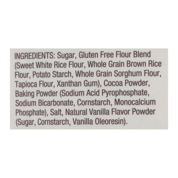 ingredients : sugar;gluten free flour blend;sweet white rice flour;whole grain brown rice flour;potato starch;whole grain sorghum flour;tapioca flour;xanthan gum;cocoa powder;baking powder;sodium acid pyrophosphate;sodium bicarbonate;cornstarch;monocalcium phosphate;salt;natural vanilla flavor powder;vanilla oleoresin