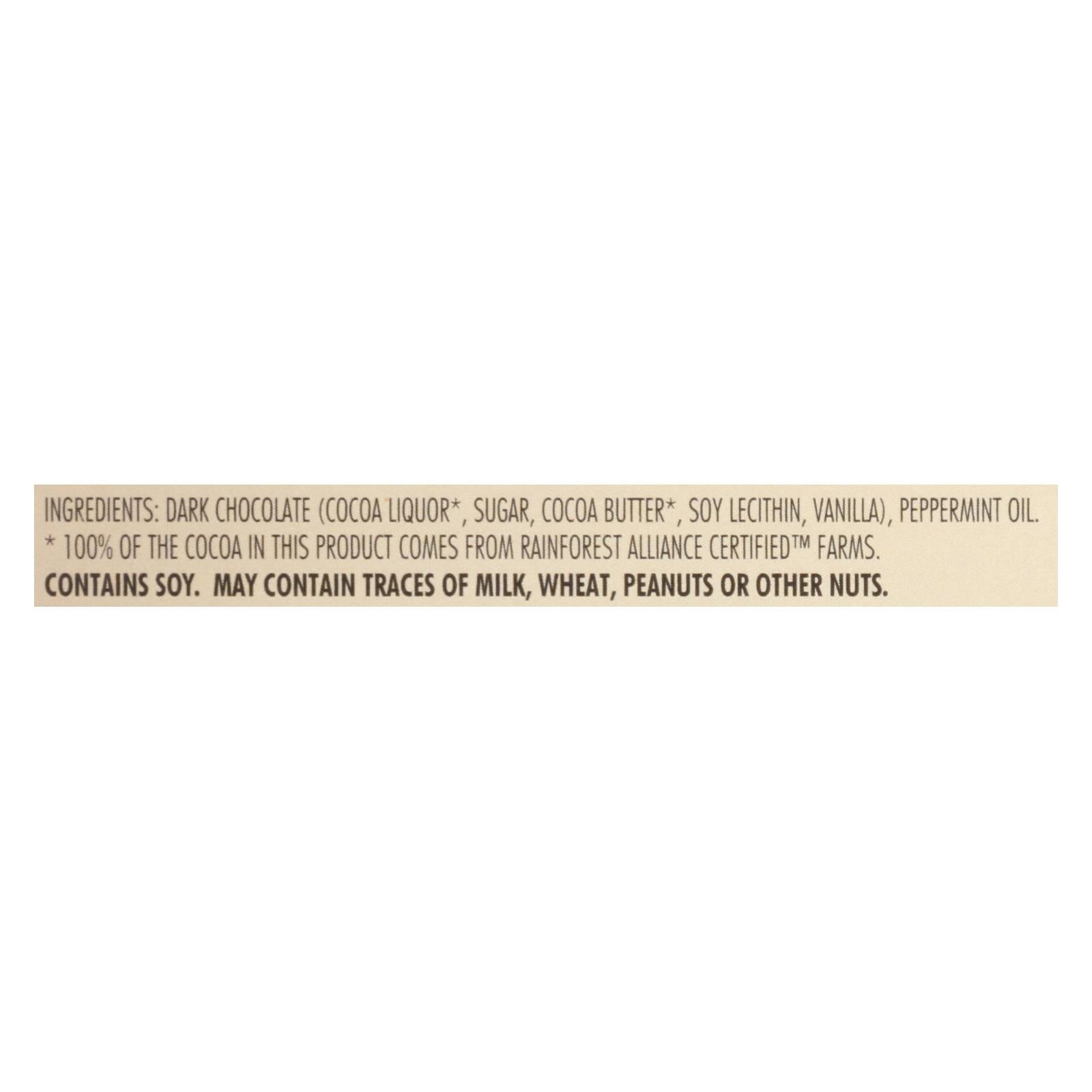 ingredients : dark chocolate (cocoa liquor*, sugar, cocoa butter*, soy lecithin, vanilla);peppermint oil