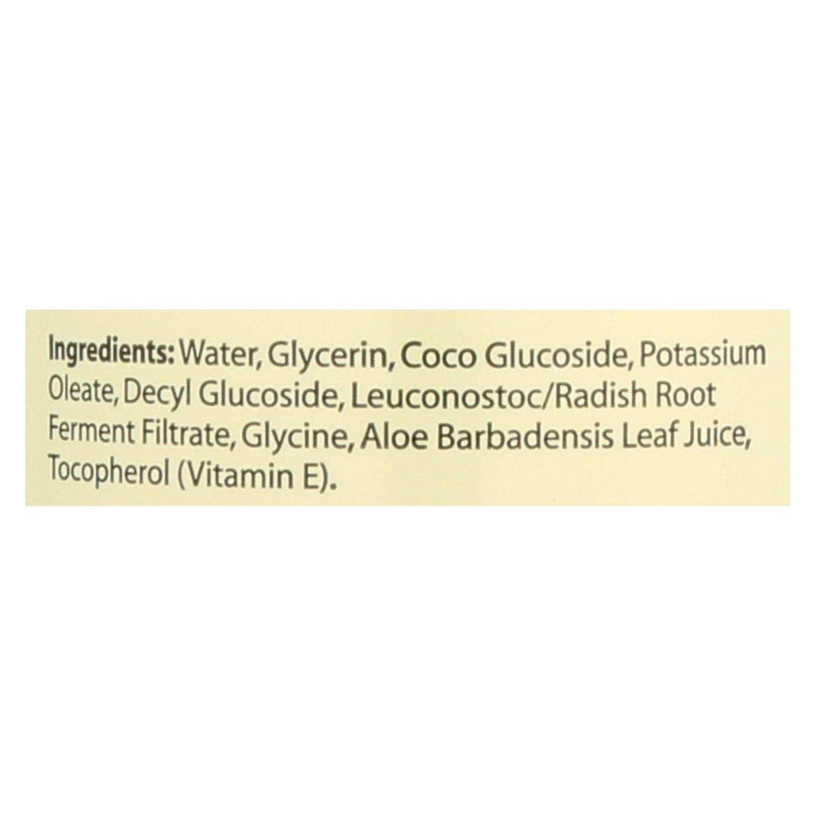 ingredients : water;glycerin;coco glucoside;potassium oleate;decyl glucoside;leuconostoc/radish root ferment filtrate;glycine;aloe barbadensis leaf juice;tocopherol;vitamin e