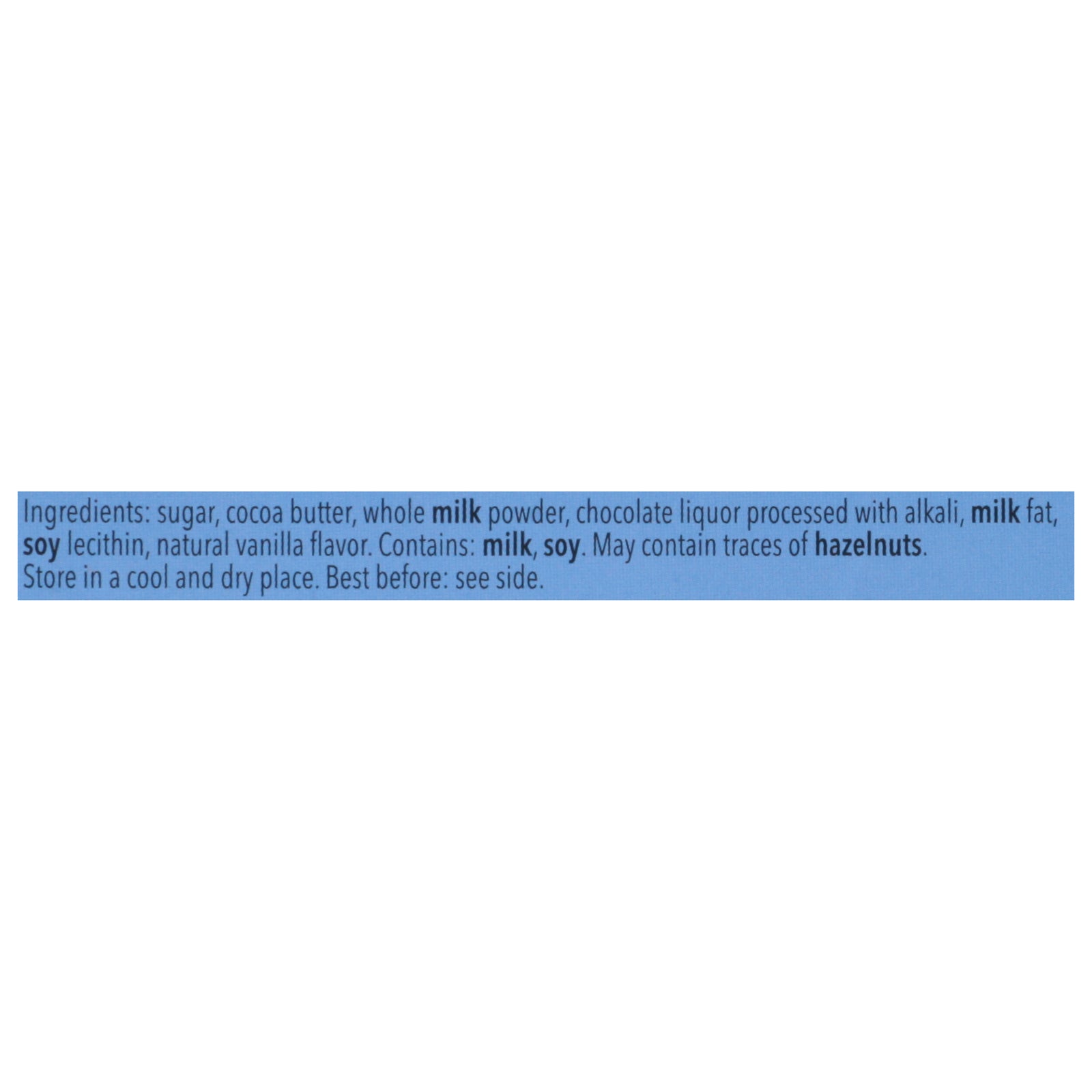 ingredients : sugar;cocoa butter;whole milk powder;chocolate liquor processed with alkali;milk fat;soy lecithin;natural vanilla flavor