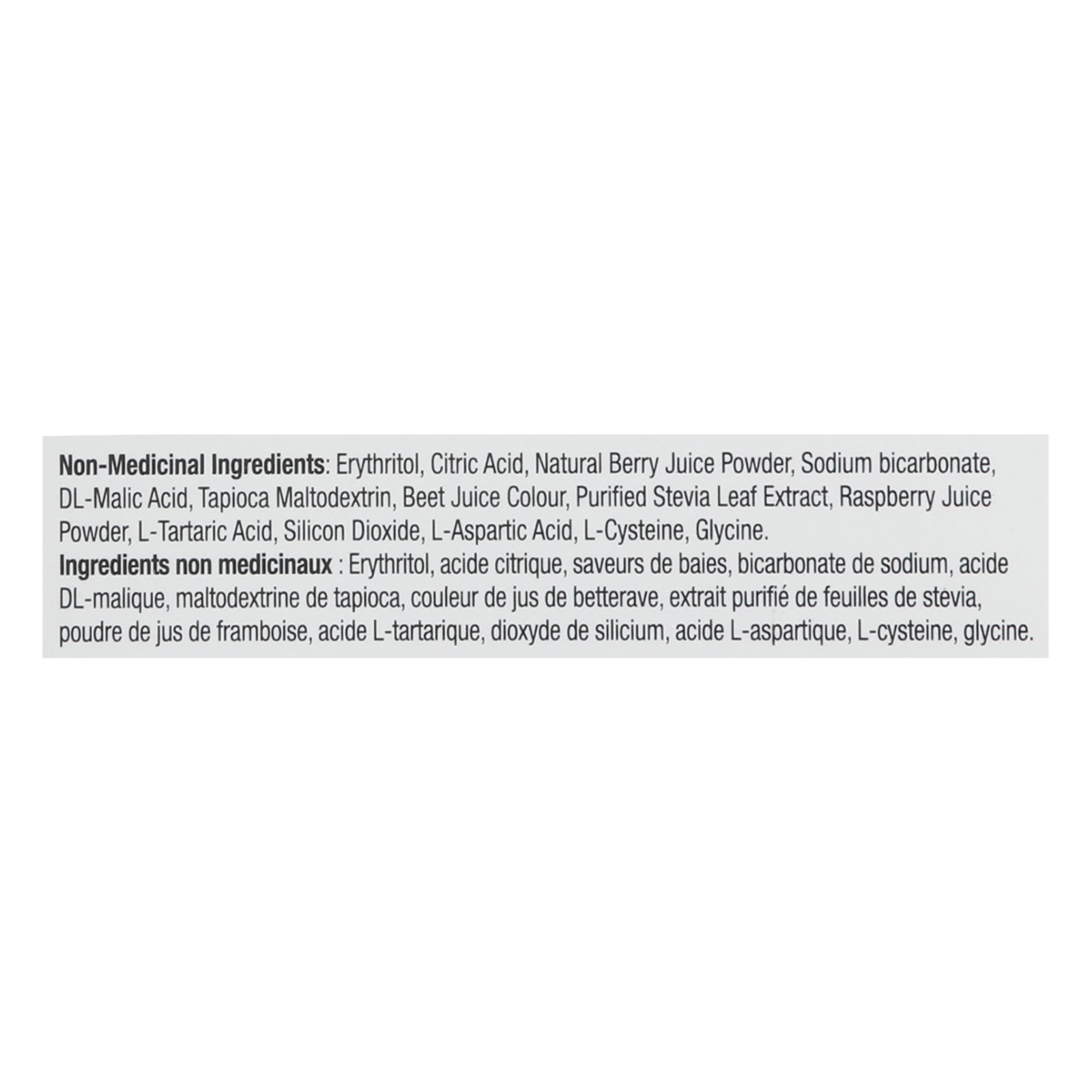 ingredients : non-medicinal: erythritol, citric acid, natural berry juice powder, sodium bicarbonate, dl-malic acid, tapioca maltodextrin, beet juice colour, purified stevia leaf extract, raspberry juice powder, l-tartaric acid, silicon dioxide, l-aspartic acid, l-cysteine, glycine