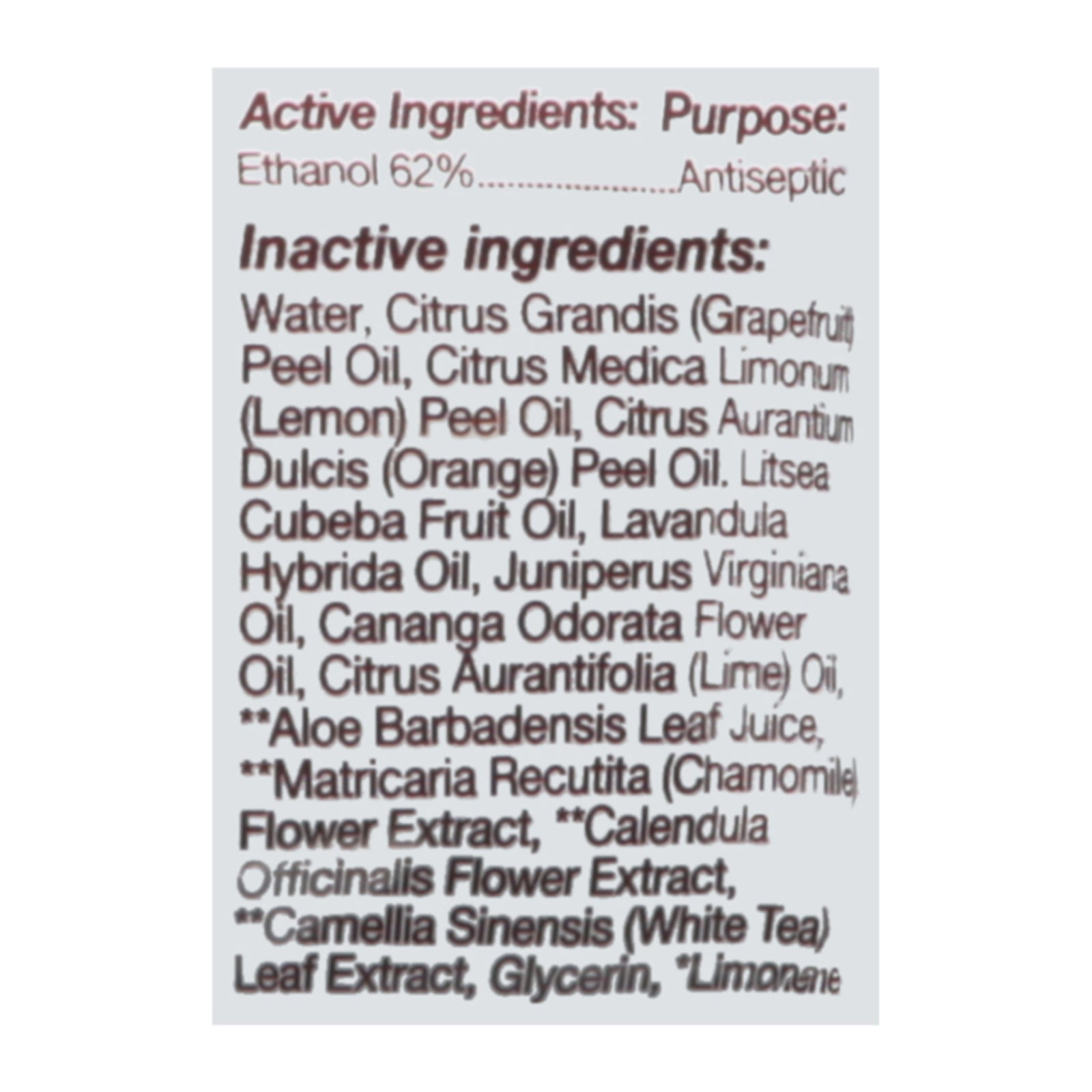 ingredients : ethanol 62% purpose: antiseptic;water;citrus grandis (grapefruit) peel oil;citrus medica limonum (lemon) peel oil;citrus aurantium dulcis (orange) peel oil;litsea cubeba fruit oil;lavandula hybrida oil;juniperus virginiana oil;cananga odorata flower oil;citrus aurantifolia (lime) oil;aloe barbadensis leaf;matricaria recutita (chamomile) flower extract;calendula officinalis flower extract;camellia sinensis (white tea) leaf extract;glycerin;limonene