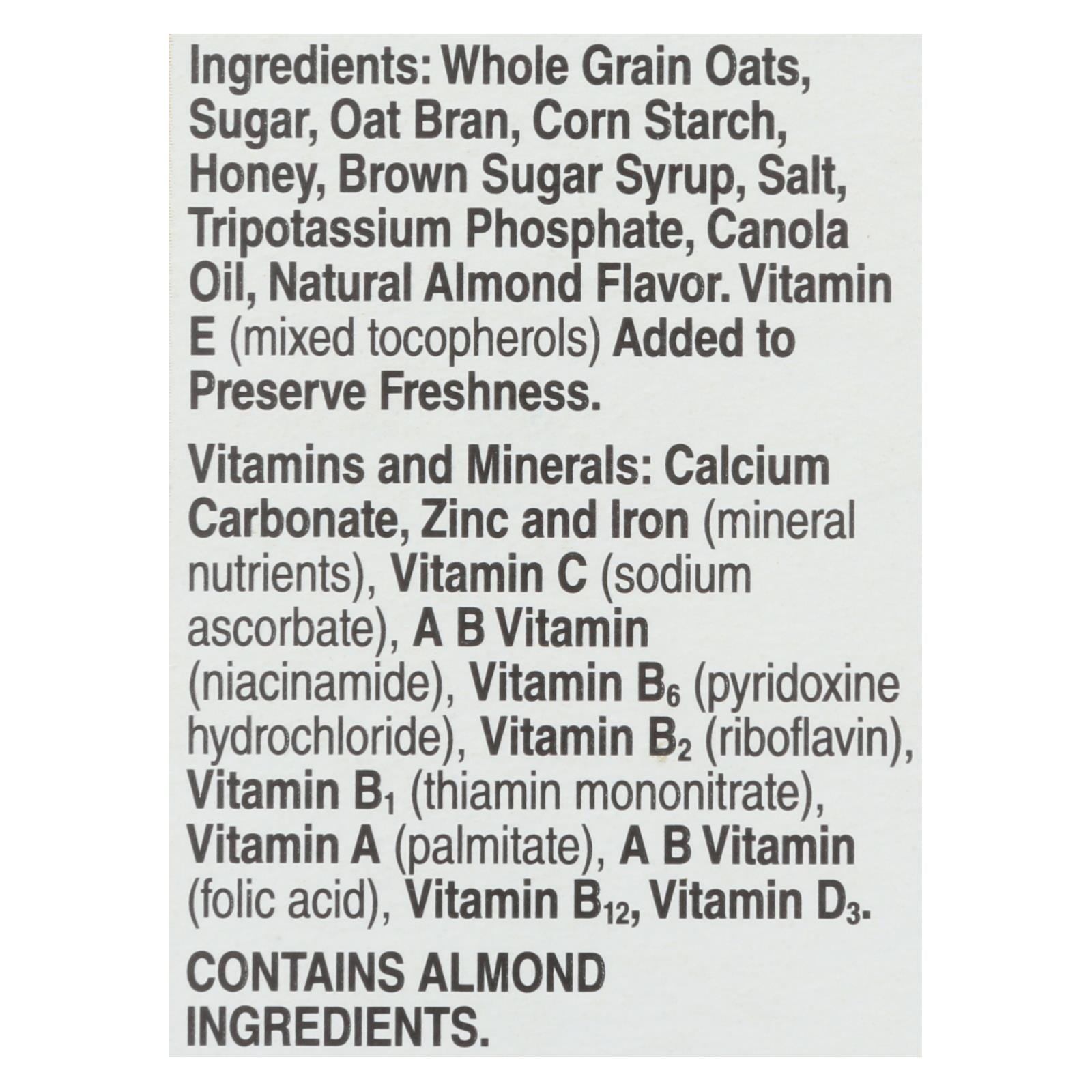 ingredients : calcium carbonate;zinc and iron;mineral nutrients;vitamin c;sodium ascorbate;a b vitamin;niacinamide;vitamin b6;pyridoxine hydrochloride;vitamin b2;riboflavin;vitamin a;palmitate;folic acid;vitamin b12;vitamin d3;whole grain oats;sugar;oat bran;corn starch;honey;brown sugar syrup;salt;tripotassium phosphate;canola oil;natural almond flavor;vitamin e;mixed tocopherols;added to preserve freshness