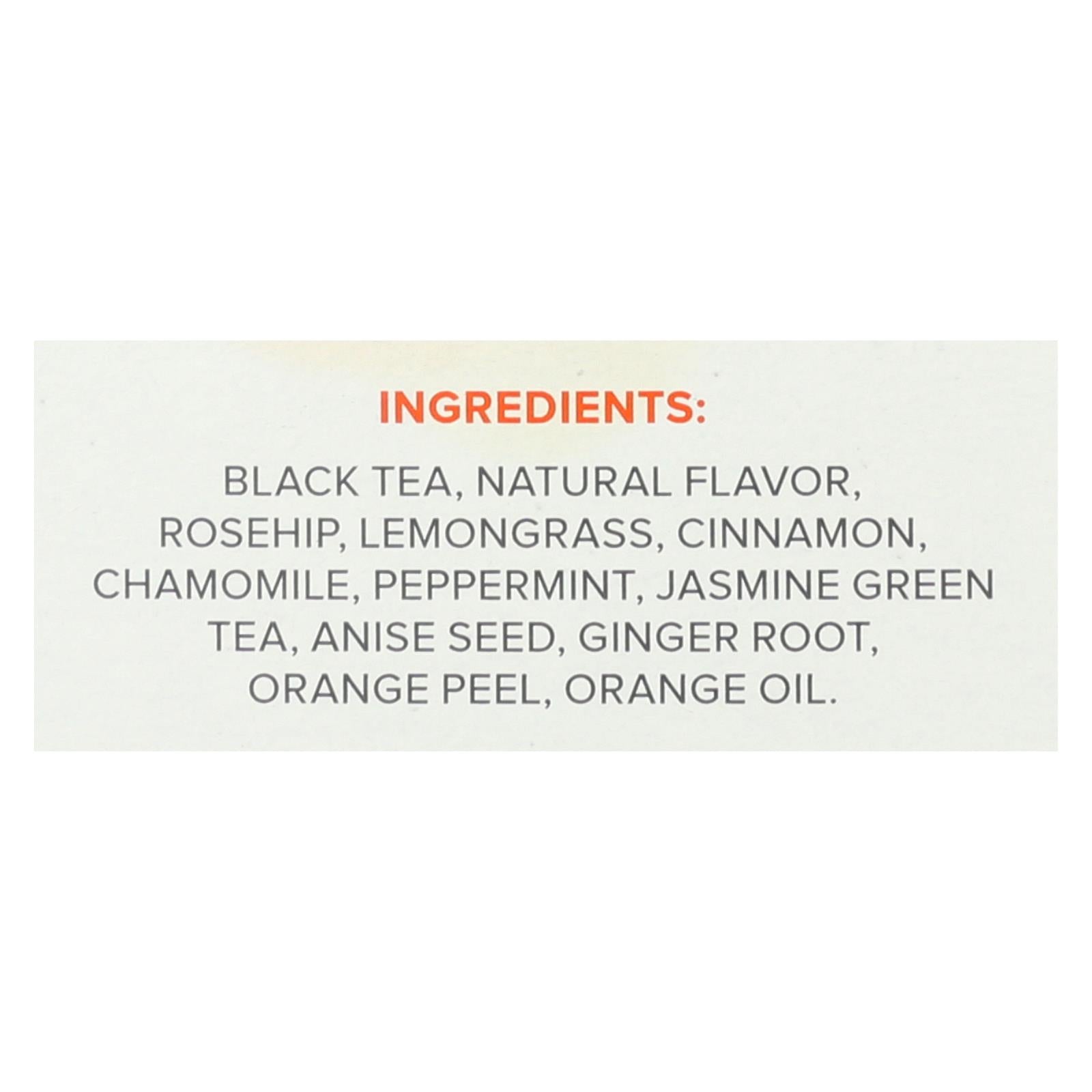 ingredients : black tea;natural flavor;rosehip;lemongrass;cinnamon;chamomile;peppermint;jasmine green tea;anise seed;ginger root;orange peel;orange oil
