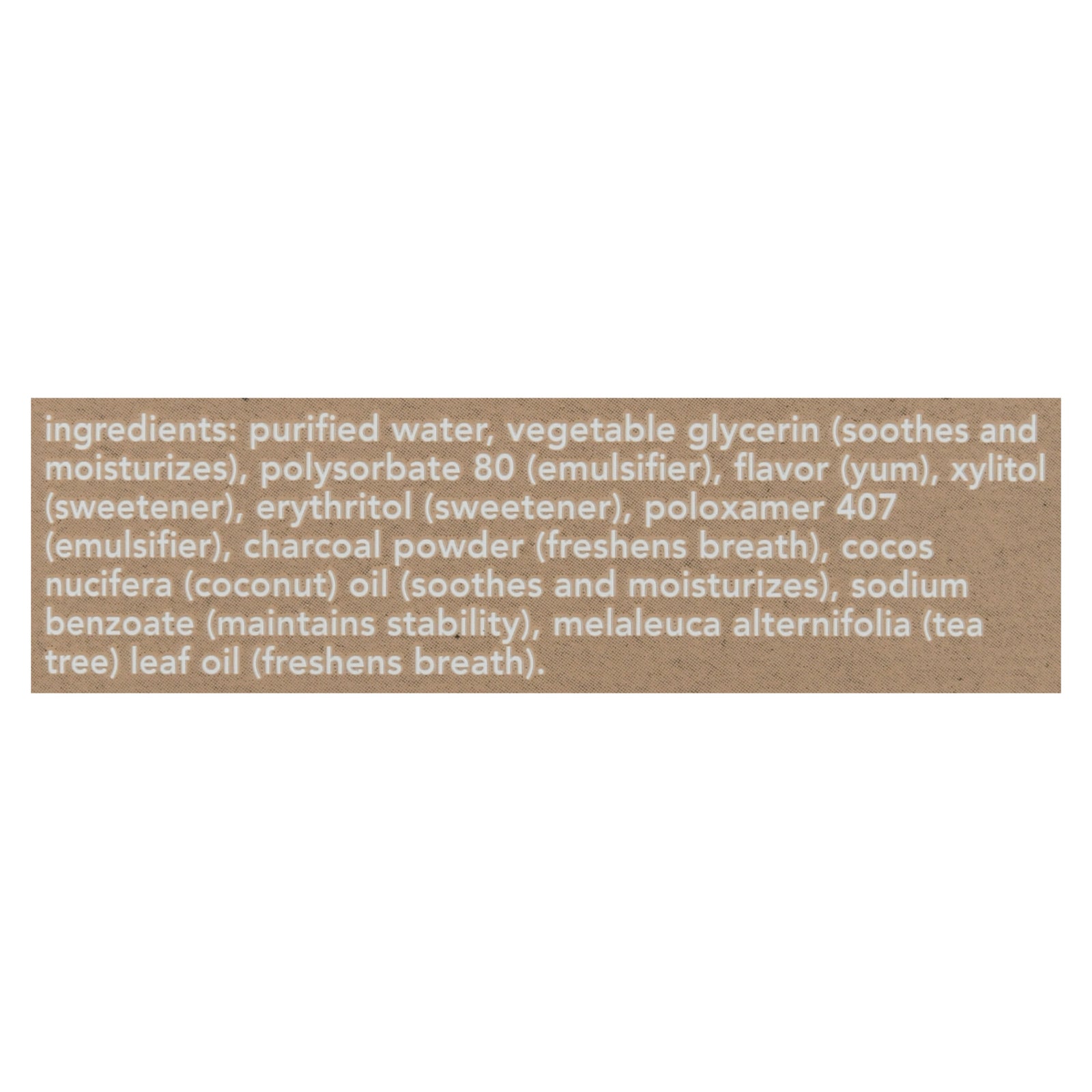 Naturally friendly. Activated charcoal extra freshening mouthwash. Natural fresh mint with coconut oil. Epic freshening. Rock tastebuds. Moisturizes mouth. Take a swish on the wild side. Black rinse might look weird, but it works brilliantly. Activated charcoal (made from sustainable bamboo) naturally freshens breath, while coconut oil moisturizes your mouth. But wait, there's more: xylitol and tea tree oil will rock your world, and bonus, there's zero alcohol. Now that's friendly. No alcohol. No dyes. No artificial sweeteners. No sls/sulfates. No brainer. For your protection, cap sealed with printed band. Choose friendly. leaping bunny certified. Never tested on animals.