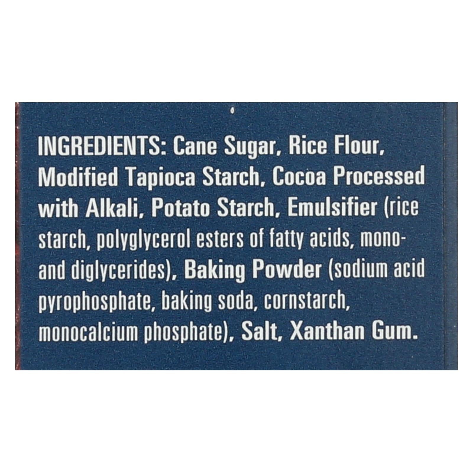ingredients : cane sugar;rice flour;cocoa (processed with alkali);tapioca starch;emulsifier (rice starch, polyglycerol esters of fatty acids, mono- and diglycerides);baking powder (corn starch, baking soda, sodium acid pyrophosphate, monocalcium phosphate);salt;xanthan gum