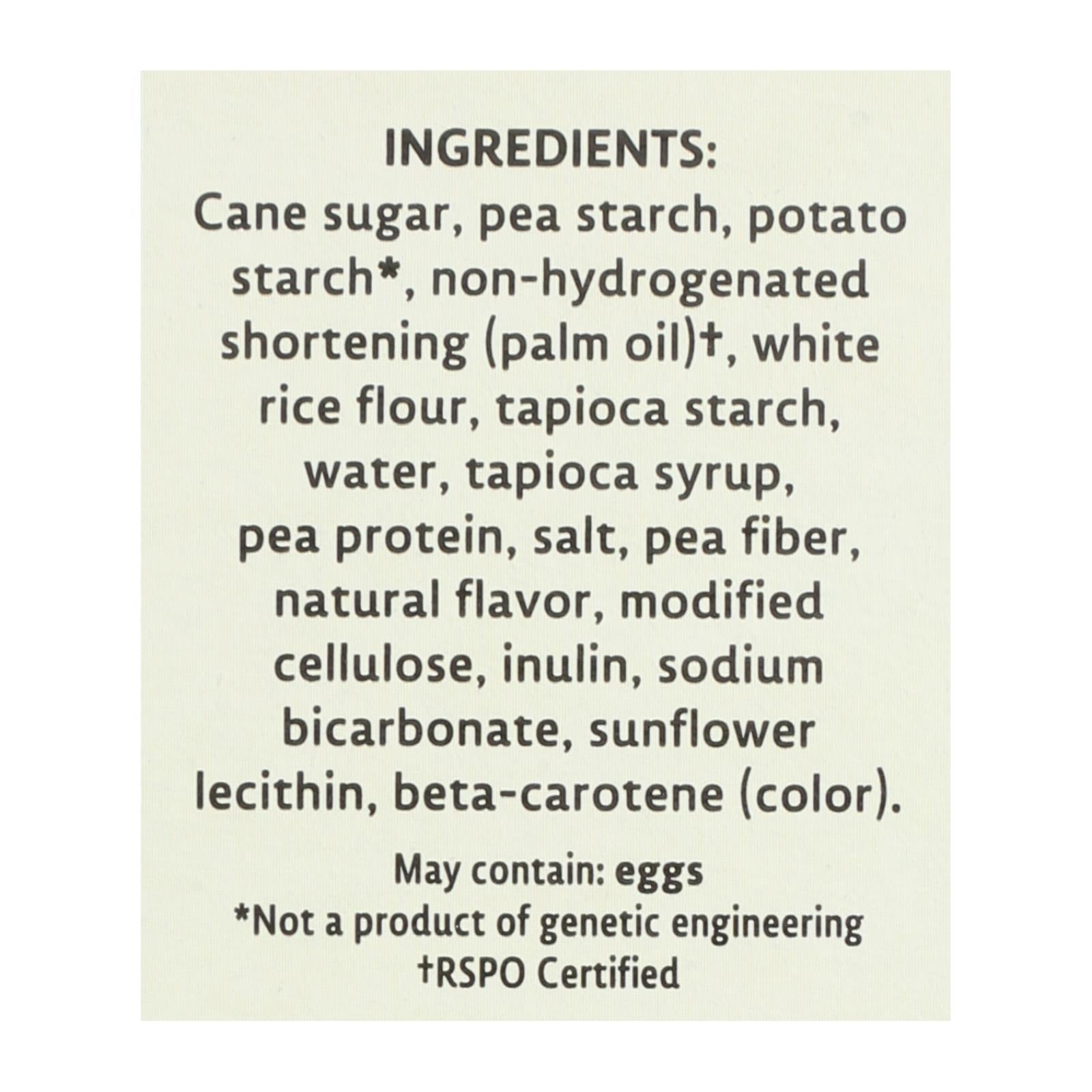 ingredients : cane sugar;pea starch;potato starch;non-hydrogenated shortening;palm oil;†;white rice flour;tapioca starch;water;tapioca syrup;pea protein;salt;pea fiber;natural flavor;modified cellulose;inulin;sodium bicarbonate;sunflower lecithin;beta-carotene;color