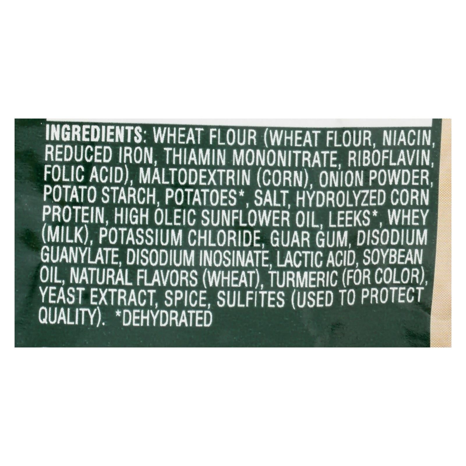 ingredients : wheat flour;niacin;reduced iron;thiamin mononitrate;riboflavin;folic acid;maltodextrin;corn;onion powder;potato starch;potatoes;salt;hydrolyzed corn protein;high oleic sunflower oil;leeks;whey;milk;potassium chloride;guar gum;disodium guanylate;disodium inosinate;lactic acid;soybean oil;natural flavors;wheat;turmeric;for color;yeast extract;spice;sulfites;used to protect quality