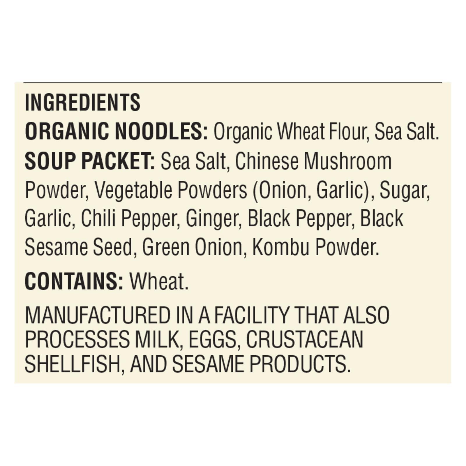 ingredients : organic noodles: organic heirloom wheat flour, sea salt;soup packet: natural sea salt, chinese mushroom powder, vegetable powders (onion, garlic), natural cane sugar, garlic, chili pepper, ginger, black pepper, black sesame seed, green onion, kombu powder