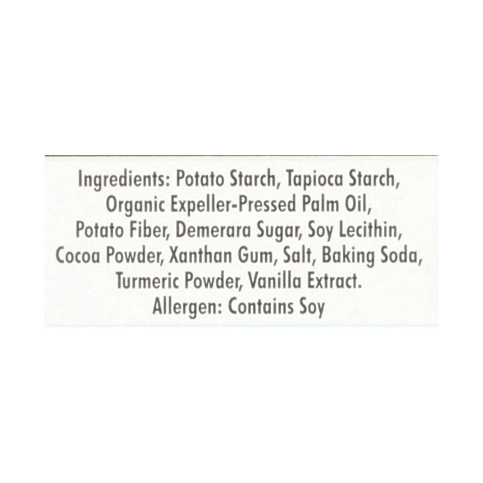 ingredients : potato starch;tapioca starch;organic expeller-pressed palm oil;potato fiber;demerara sugar;soy lecithin;xanthan gum;salt;baking soda;turmeric powder;vanilla extract