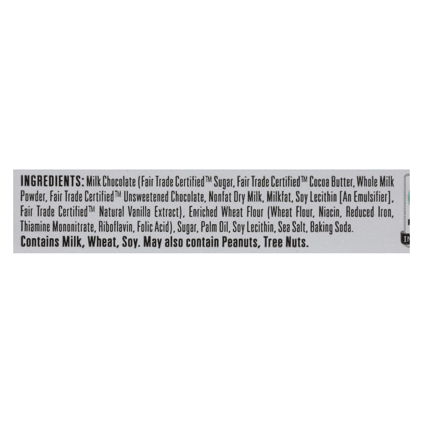 ingredients : milk chocolate (fair trade certified™ sugar, fair trade certified™ cocoa butter, whole milk powder, fair trade certified™ unsweetened chocolate, soy lecithin, vanilla extract);enriched wheat flour (wheat flour, niacin, iron, thiamine, riboflavin, folic acid);palm oil;sugar;sugar cane fiber;sea salt;soy lecithin;ascorbic acid