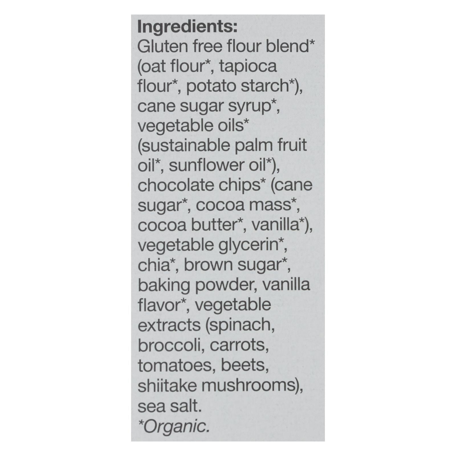 ingredients : gluten free flour blend;oat flour;tapioca flour;potato starch;cane sugar syrup;vegetable oils;sustainable palm fruit oil;sunflower oil;chocolate chips;cane sugar;cocoa mass;cocoa butter;vanilla;vegetable glycerin;chia;brown sugar;baking powder;vanilla flavor;vegetable extracts;spinach;broccoli;carrots;tomatoes;beets;shiitake mushrooms;sea salt