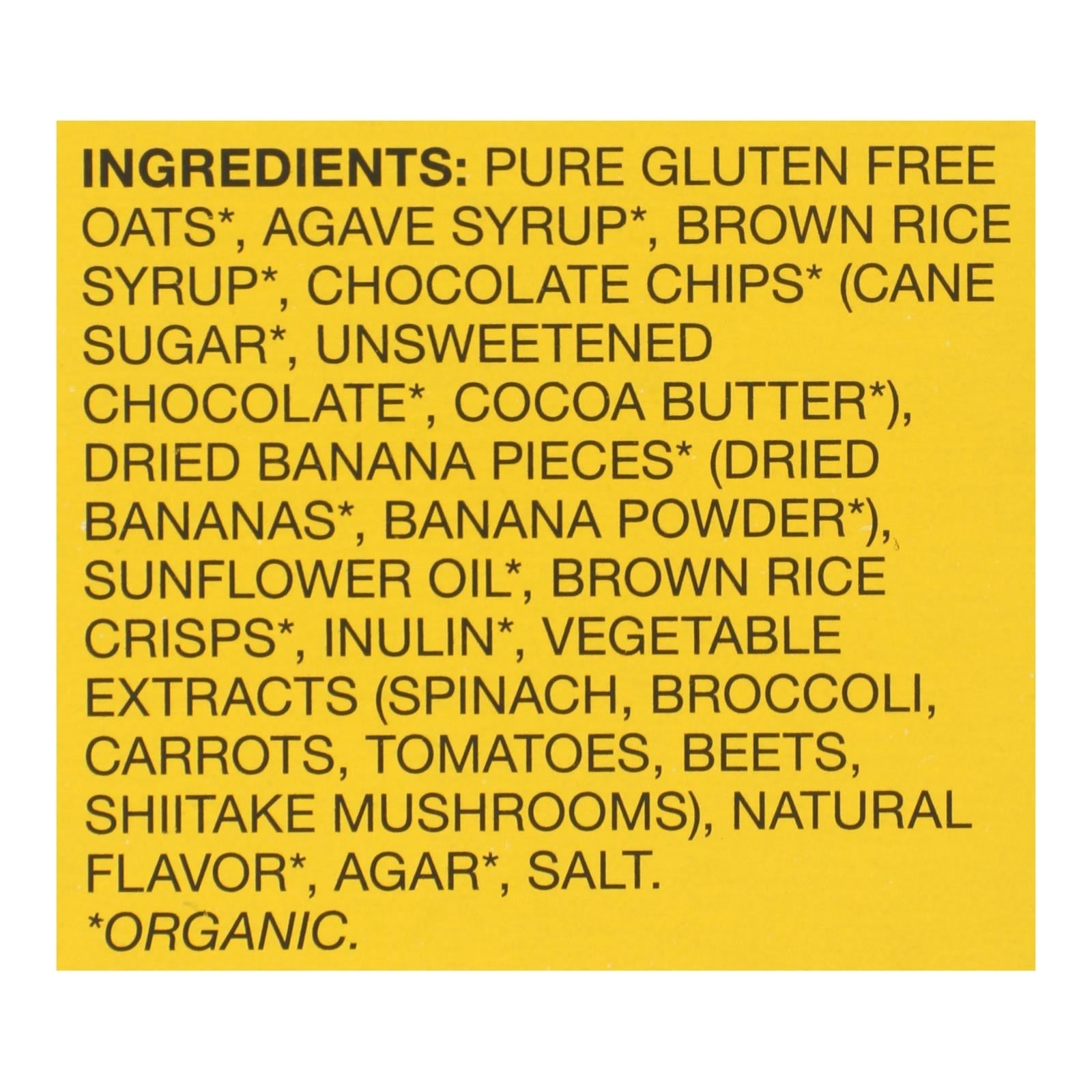 ingredients : pure gluten free oats;agave syrup;brown rice syrup;chocolate* (cane sugar*, unsweetened chocolate*, cocoa butter*);dried banana pieces* (dried bananas*, banana powder*);sunflower oil;invert cane syrup;brown rice crisps;vegetable extracts (spinach, broccoli, carrots, tomatoes, beets, shiitake mushrooms);natural flavor;agar;salt