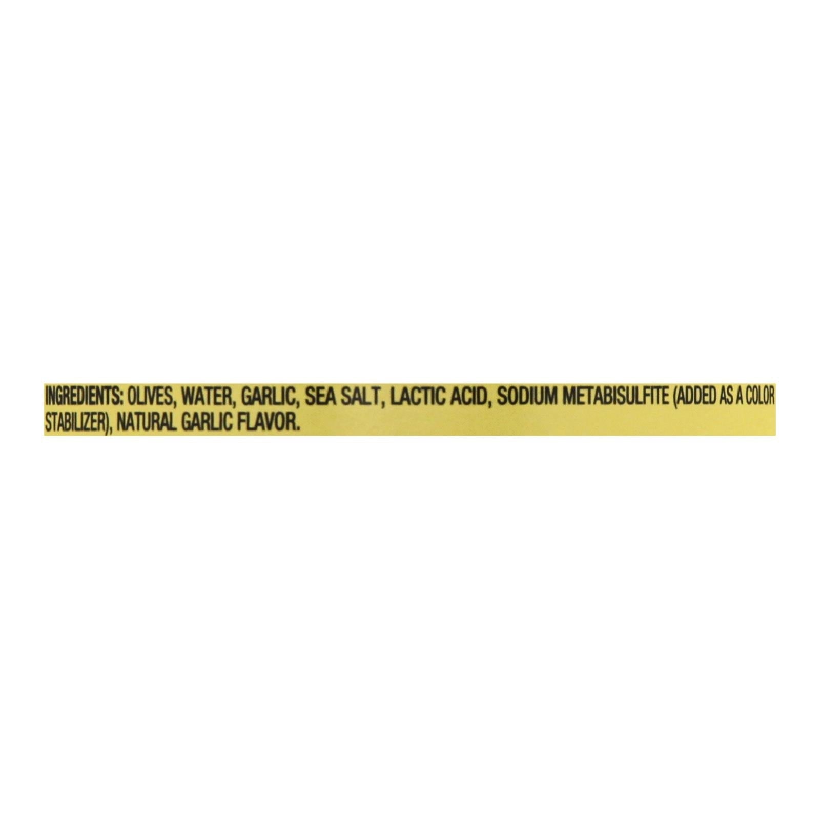ingredients : olives, water, garlic, sea salt, lactic acid, sodium metabisulfite (added as a color stabilizer), natural garlic flavor.