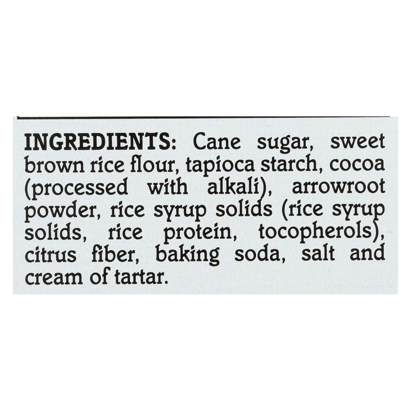ingredients : cane sugar;sweet brown rice flour;tapioca starch;cocoa (processed with alkali);arrowroot powder;rice syrup solids (rice protein, natural mixed tocopherols);{added to maintain freshness});citrus fiber;baking soda;salt and cream of tartar