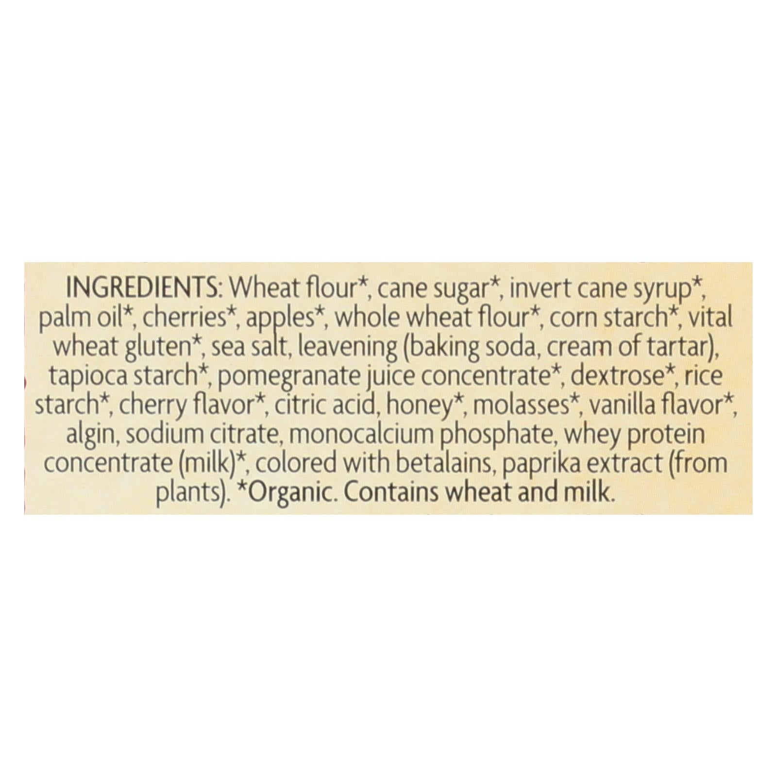 ingredients : wheat flour;cane sugar;invert cane syrup;palm oil;cherries;apples;whole wheat flour;corn starch;vital wheat gluten;sea salt;leavening;baking soda;cream of tartar;tapioca starch;pomegranate juice concentrate;dextrose;rice starch;cherry flavor;citric acid;honey;molasses;vanilla flavor;algin;sodium citrate;monocalcium phosphate;whey protein concentrate;milk;colored with betalains;paprika extract;from plants