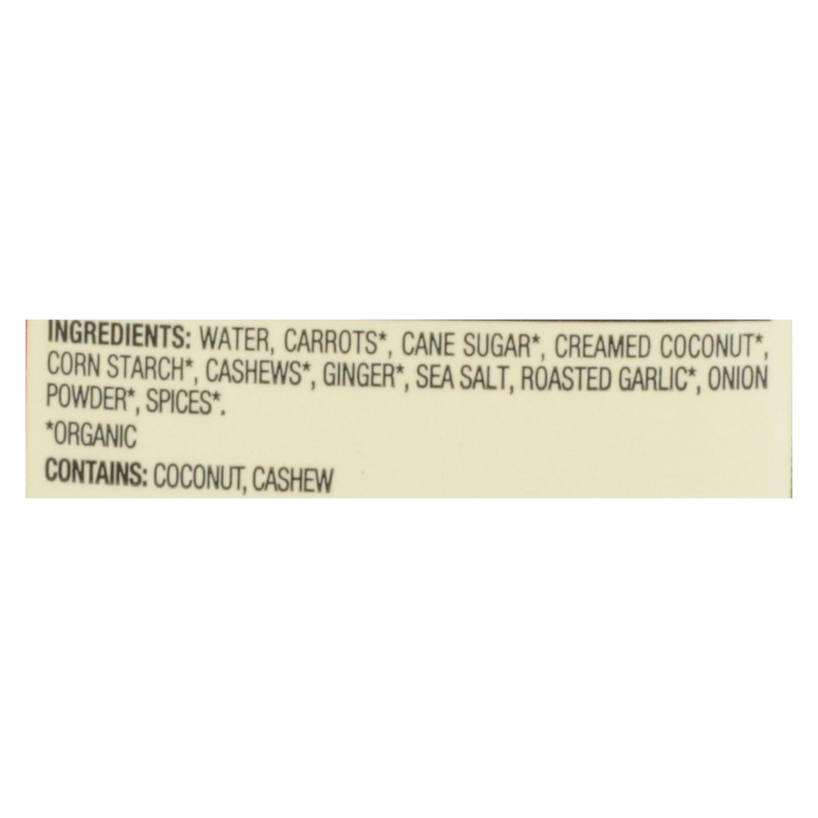 ingredients : water;carrots;cane sugar;creamed coconut;corn starch;cashews;ginger;sea salt;roasted garlic;onion powder;spices