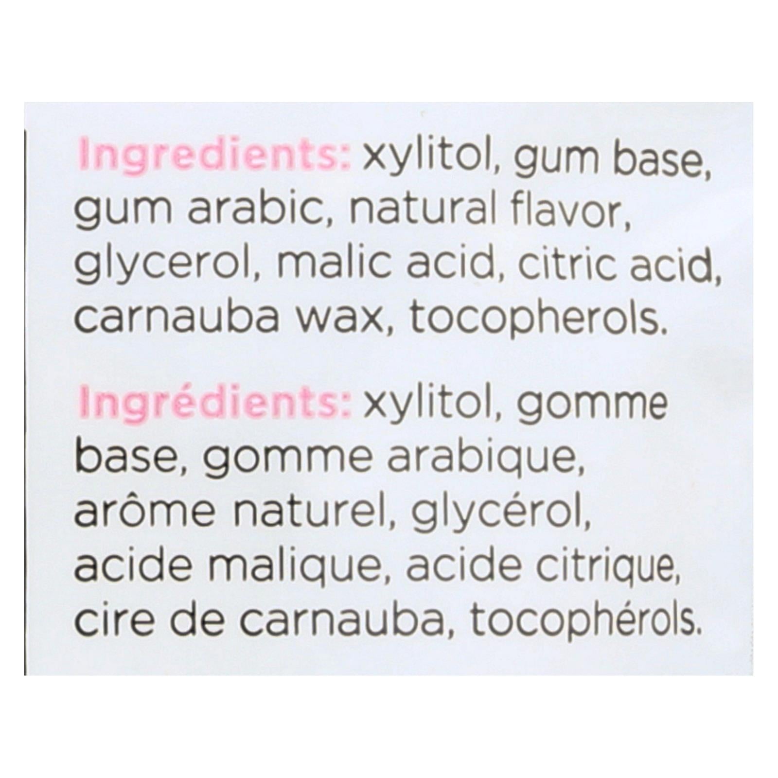 ingredients : xylitol;gum base;gum arabic;natural flavor;glycerol;malic acid;citric acid;carnauba wax;tocopherols