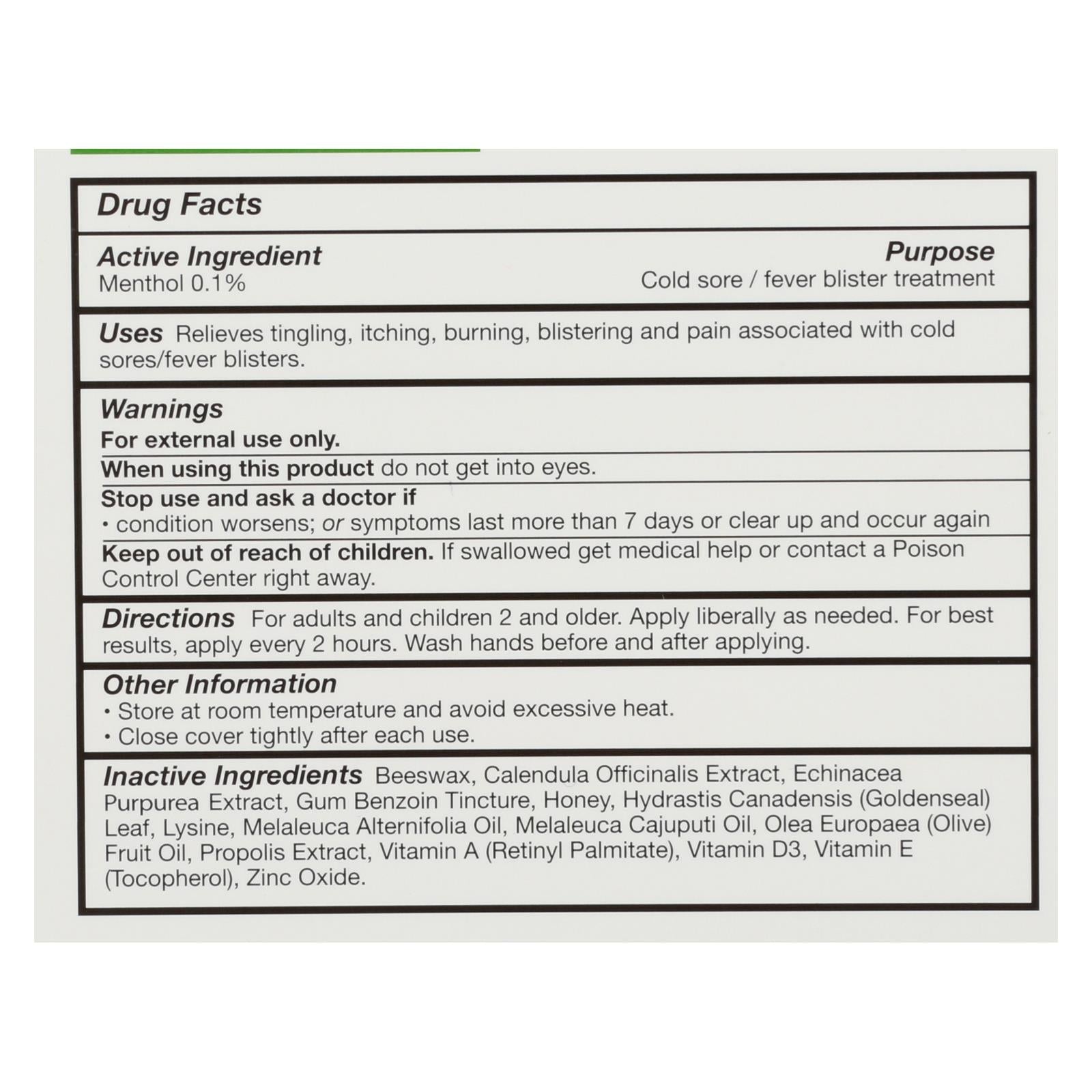 ingredients : drug facts active ingredient menthol 0.1% purpose cold sore/fever blister treatment inactive beeswax;calendula officinalis extract;echinacea purpurea extract;gum benzoin tincture;honey;hydrastis canadensis;goldenseal;leaf;lysine;melaleuca alternifolia oil;melaleuca cajuputi oil;olea europaea;olive;fruit oil;propolis extract;vitamin a;retinyl palmitate;vitamin d3;vitamin e;tocopherol;zinc oxide