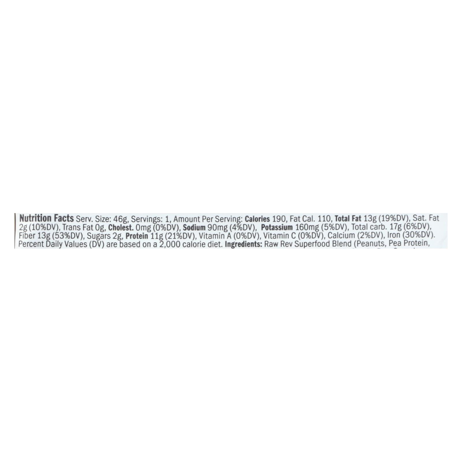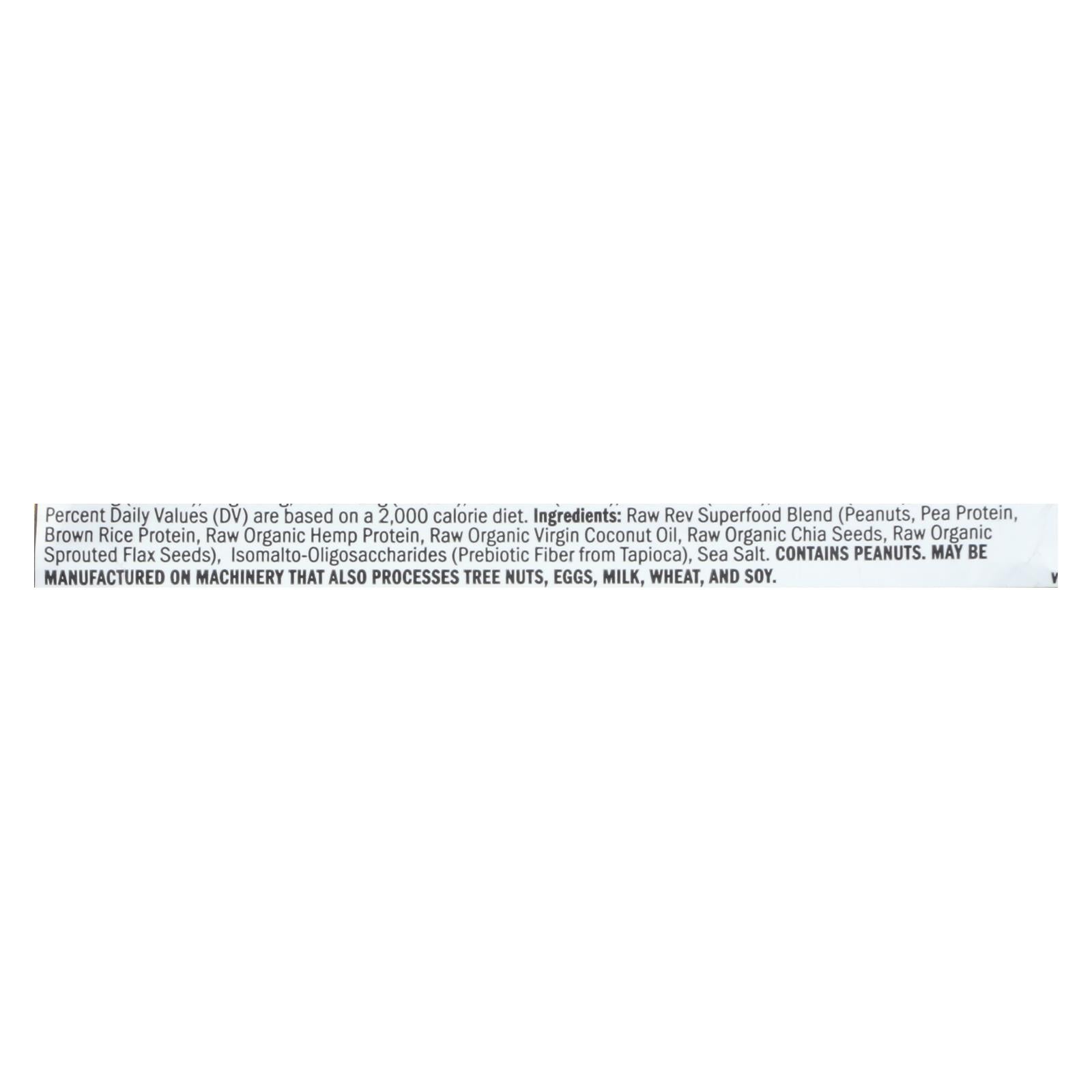 ingredients : raw rev superfood blend;peanuts;pea protein;brown rice protein;raw organic hemp protein;raw organic virgin coconut oil;raw organic chia seeds;raw organic sprouted flax seeds;isomalto-oligosaccharides;prebiotic fiber from tapioca;sea salt